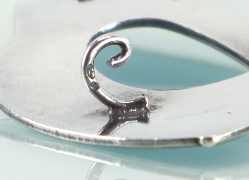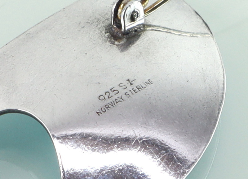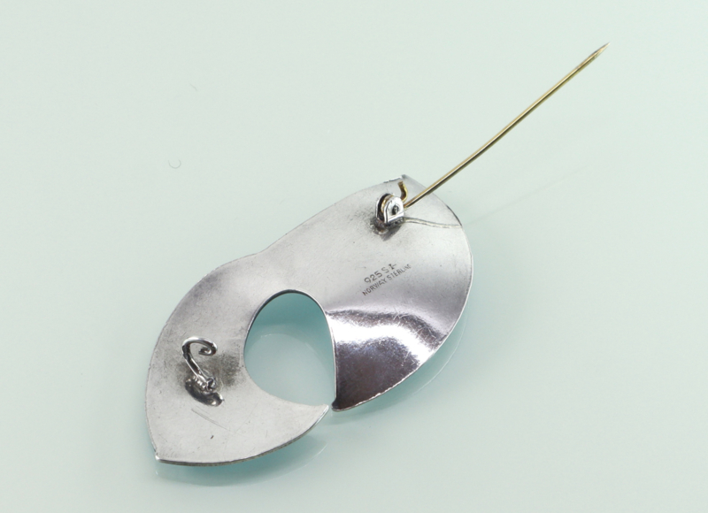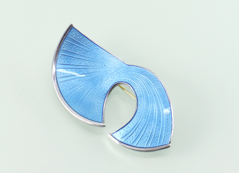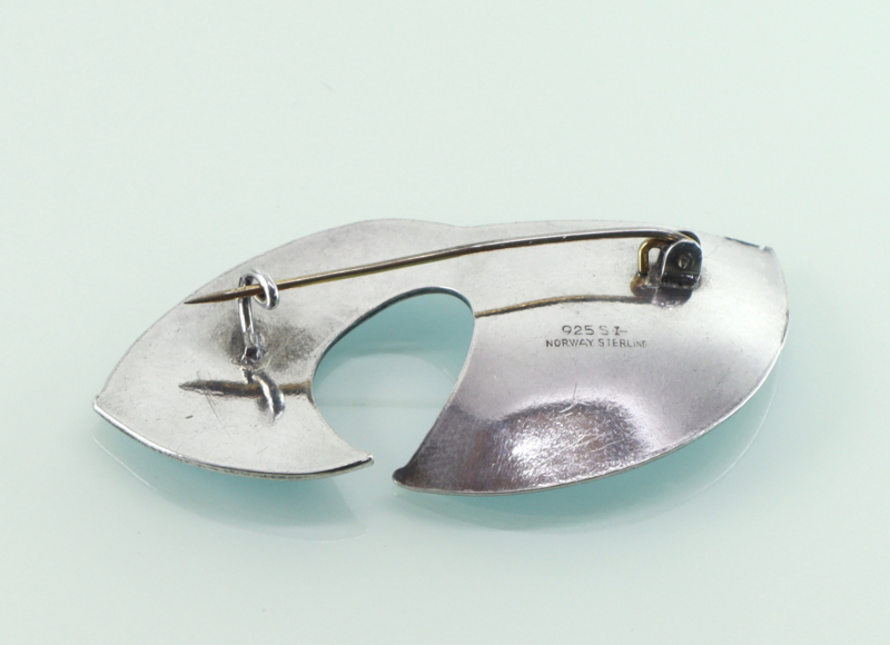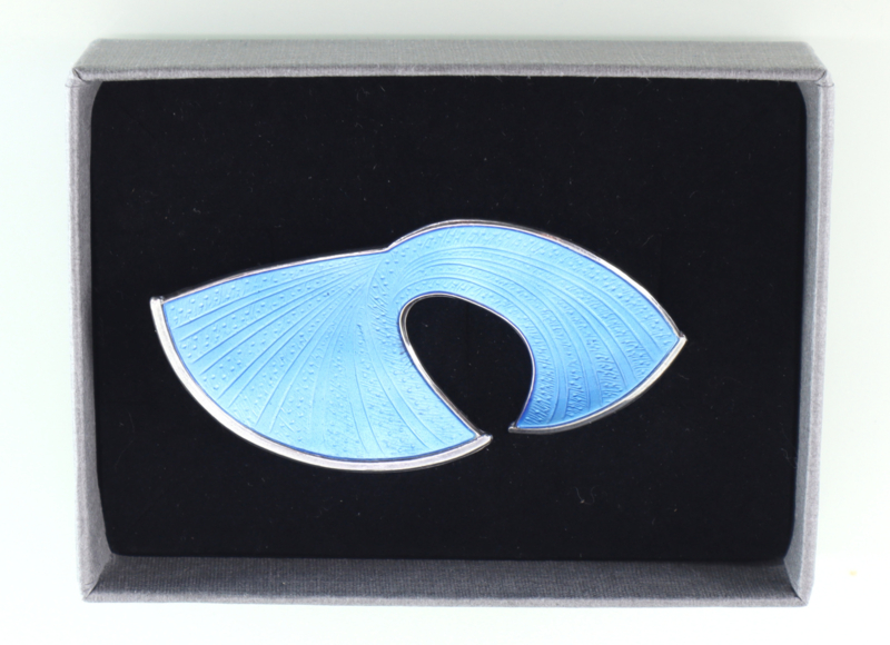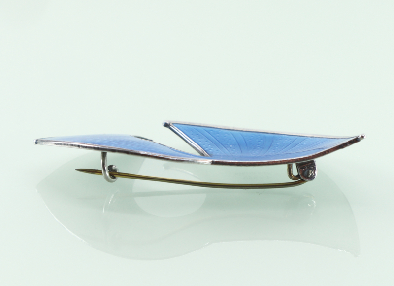 Prachtige eerste gehalte zilveren broche met blauw email gemaakt door Knut Andreas Rasmussen, Oslo Noorwegen in de jaren ’50. De broche heeft twee waaiervormen met aan de randen een bredere zilveren rand. Onder het email is het zilver bewerkt waardoor er diepte ontstaat. De pin is zeer waarschijnlijk van verzilverd messing en werkt goed. Aan de achterzijde is de broche gekeurd met 925S en Norway Sterling voor eerste gehalte zilver. Ook staat er de dubbele bijl in; het meesterteken van Knut A. Rasmussen (Oslo, 1837-1960). Op het haakje van de sluiting staan het teken van Zweden en de S voor zilver hetgeen aangeeft dat deze broche ooit een keer verkocht is in Zweden. De broche verkeert in uitstekende conditie en het email is onbeschadigd.