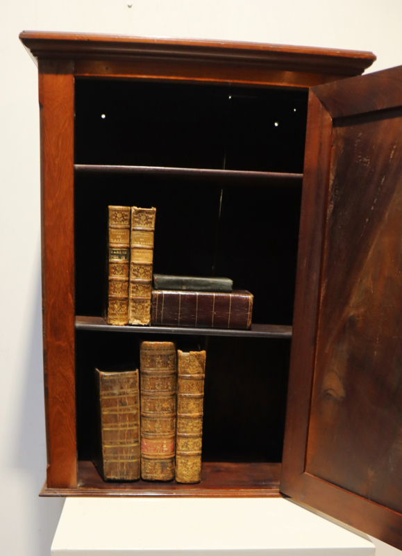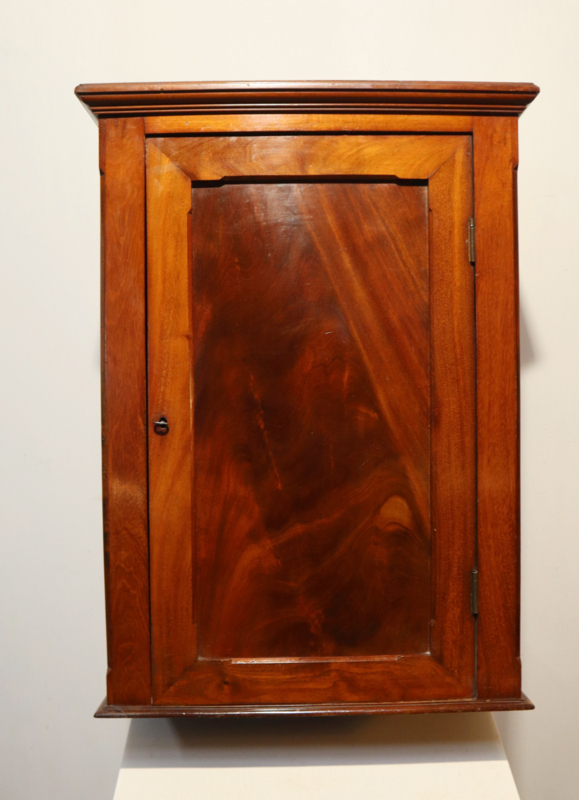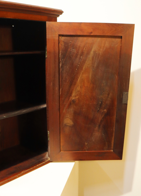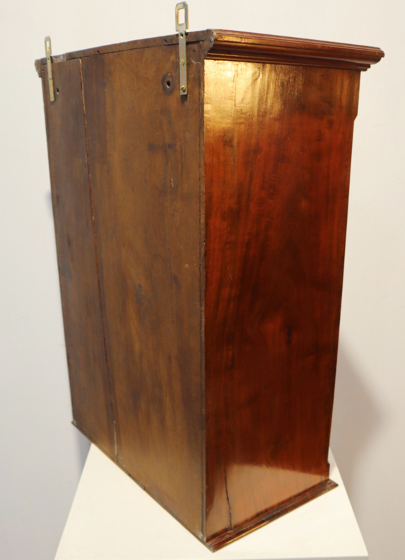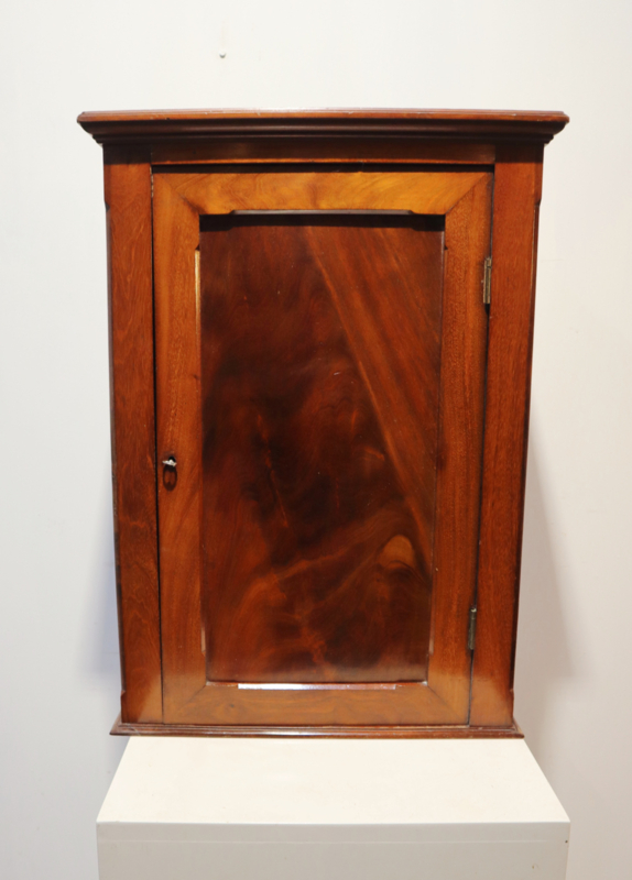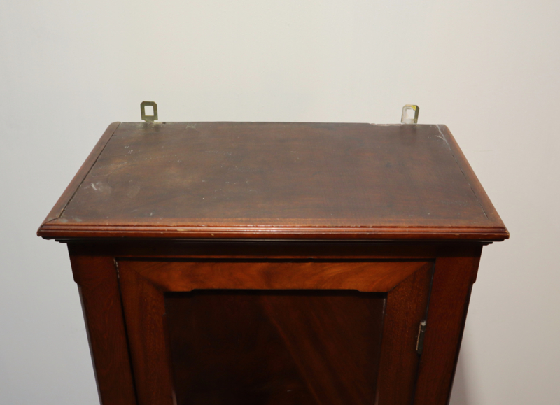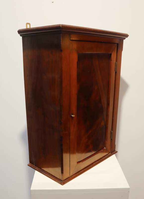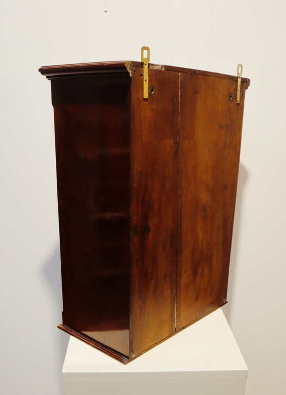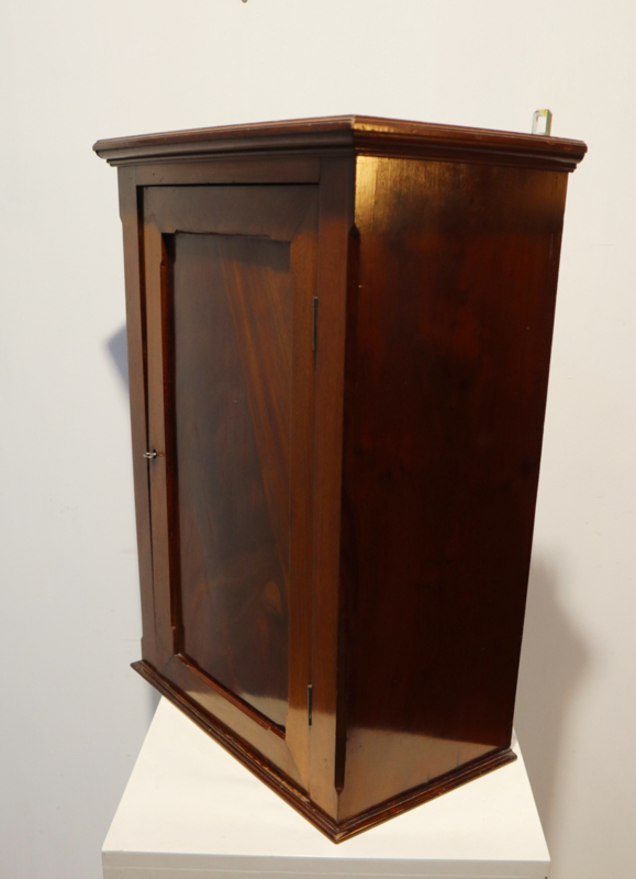 Fraai antiek hangkastje met paneeldeur met slotje en twee originele legplankjes aan de binnenzijde. Het heeft een aantrekkelijke warme kleur en het is van mooie kwaliteit. Door het niet al te grote formaat is het ook makkelijk inpasbaar. Leuk om bijvoorbeeld in een gang of keuken op te hangen.