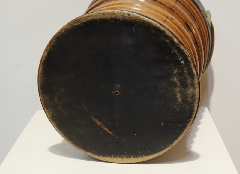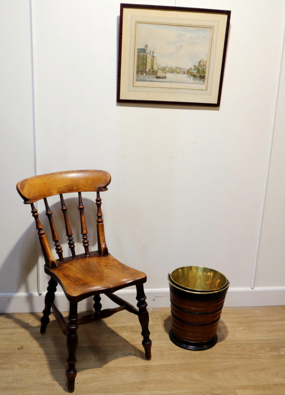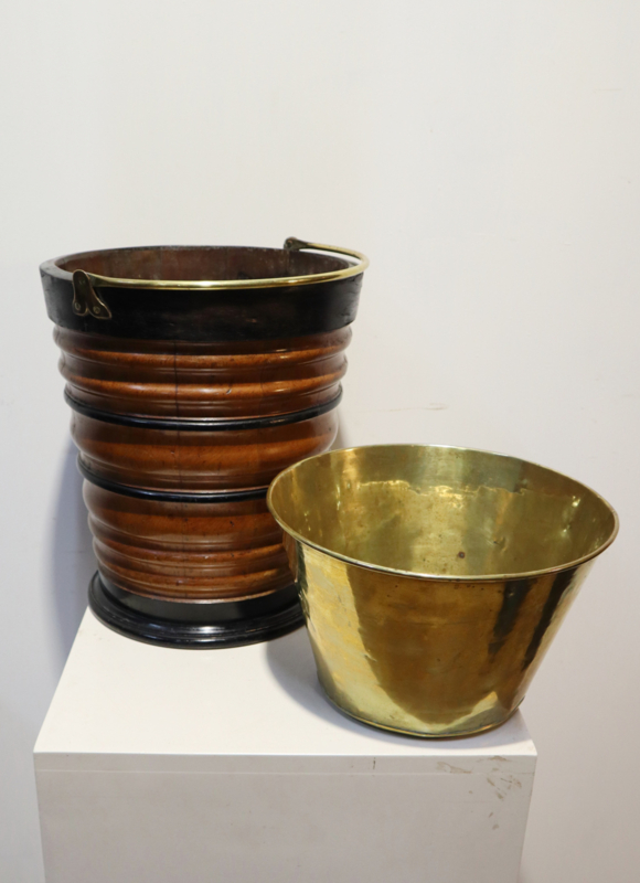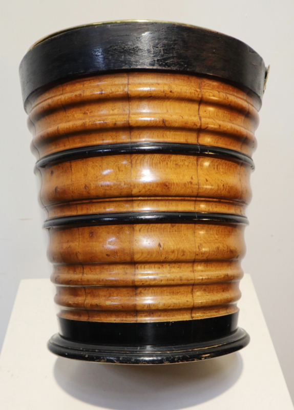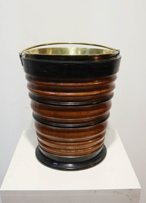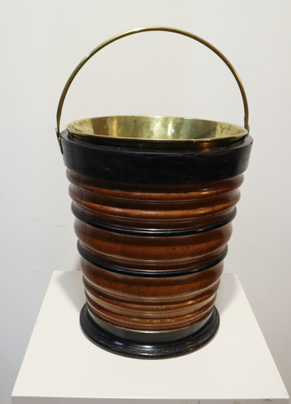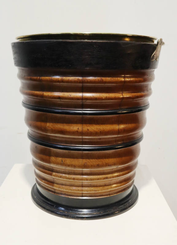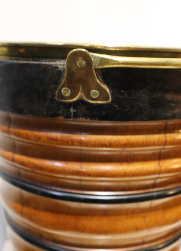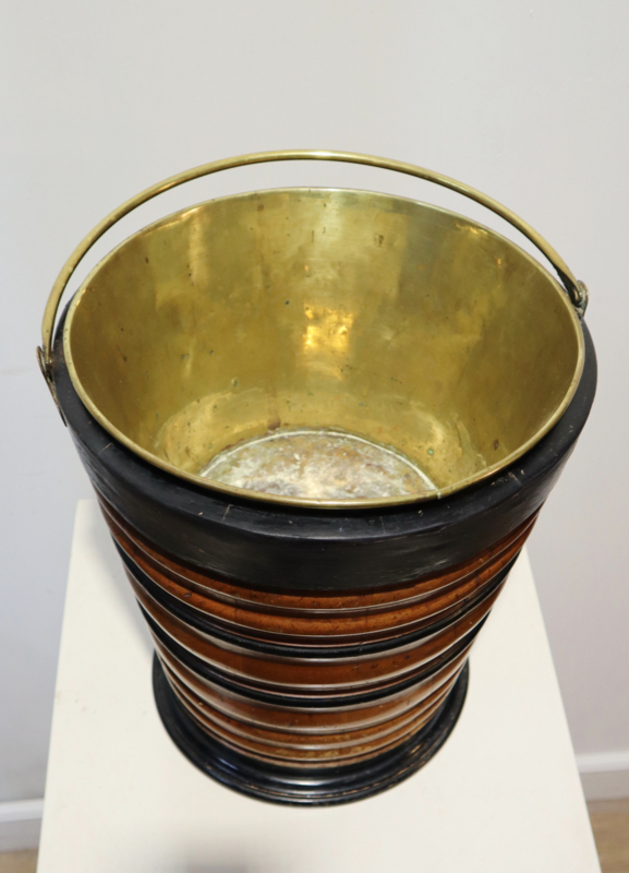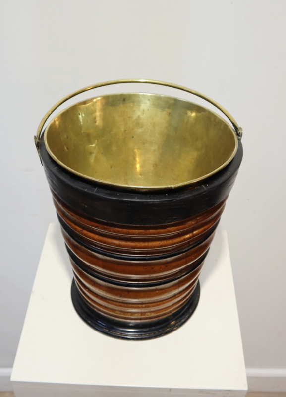 Fraaie antieke houten emmer met koperen hengsel en originele koperen binnenbak. Deze emmer werd vroger gebruikt om een kan warm te houden. Het is "geduigd" en heeft een aantrekkelijke horizontaal kleurenpatroon. Leuk om als bijvoorbeeld plantenpot, prullenbakje of als decoratief stuk.