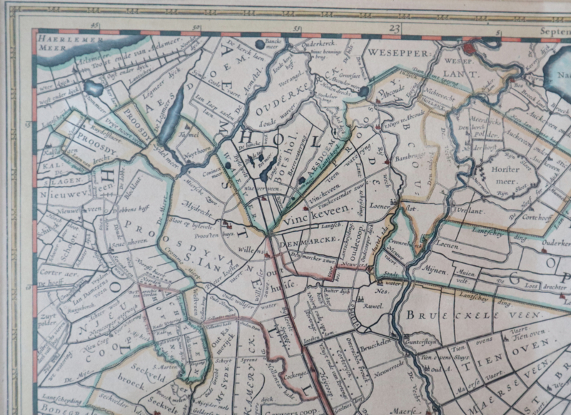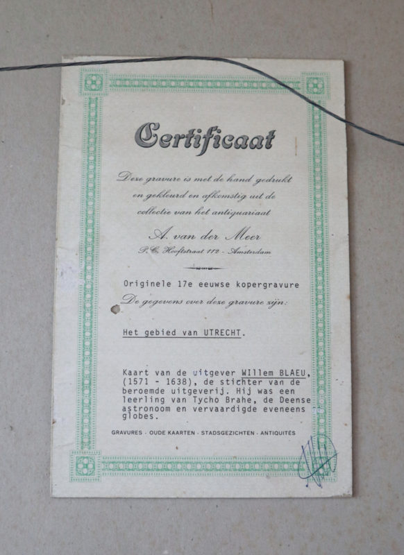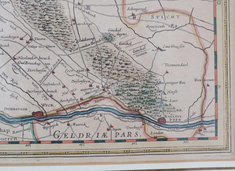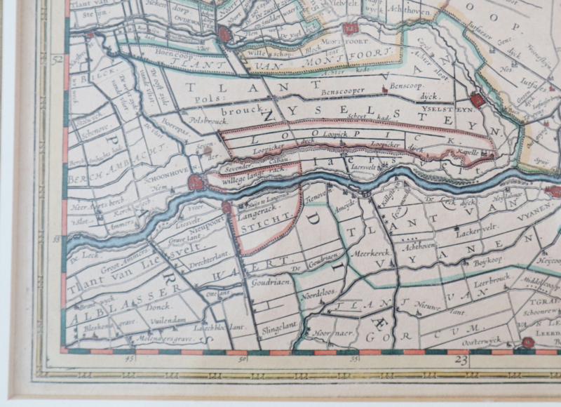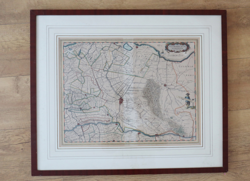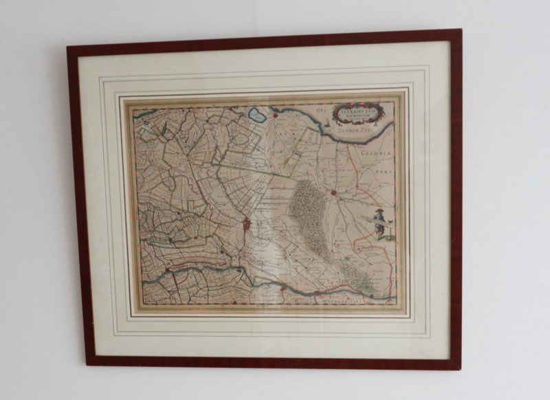 Mooie antieke landkaart / kopergravure van de provincie Utrecht uitgegeven in ca. 1635 door de (bekende) Nederlandese cartograaf en uitgever Willem Janszoon Blaeu (1571-1638). Titel: Ultrajectum Dominium. Deze in de tijd gekleurde kaart is afkomstig uit een atlas met aan de achterzijde teksten in het latijn. Rechtsboven het titelcartouche met het uitgeversimpressum en daaronder een afbeelding met schaalstok. De kaart zit in een oude lijst (firma Heijdenrijk) met passepartout. Het geeft een mooi beeld van de tijd dat er nog geen snelwegen waren maar wel karresporen en kanalen met trekschuiten.