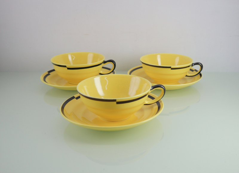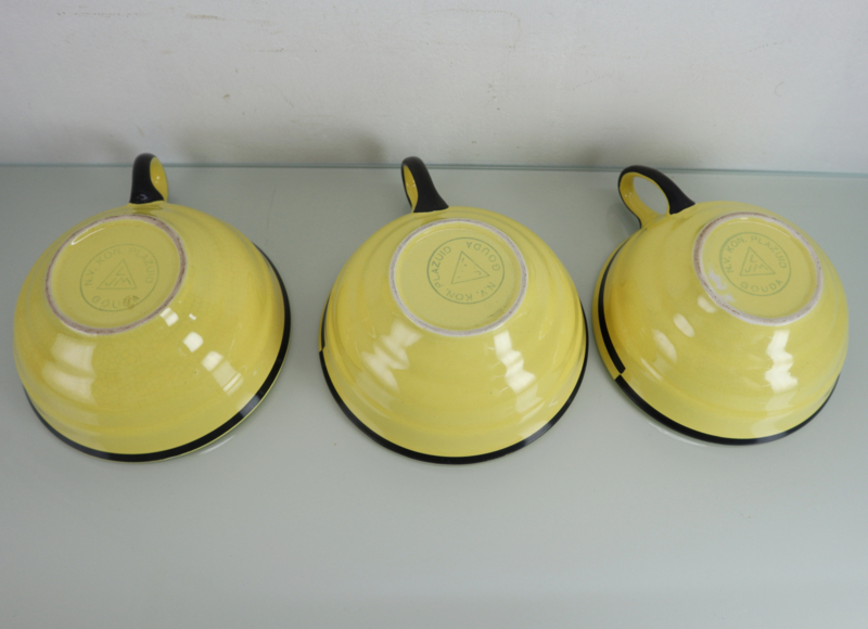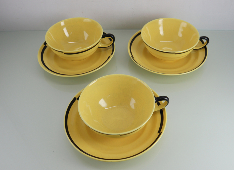Stijlvolle set van drie plateel kop en schotels in Art Deco stijl, gemaakt door Plateelbakkerij Zuid Holland in Gouda (plazuid). Ontwerp: Leendert Johan Muller (1879-1969). Allen zijn gemerkt aan de onderzijde met: "N.V. Kon. Plazuid Gouda, LJM