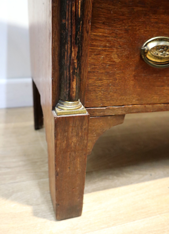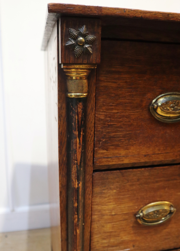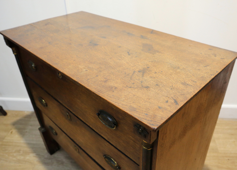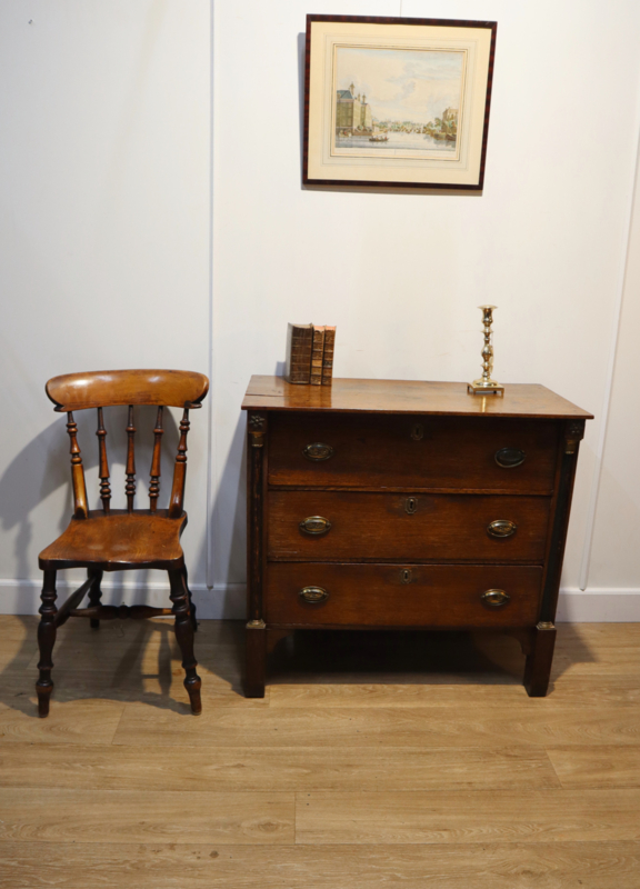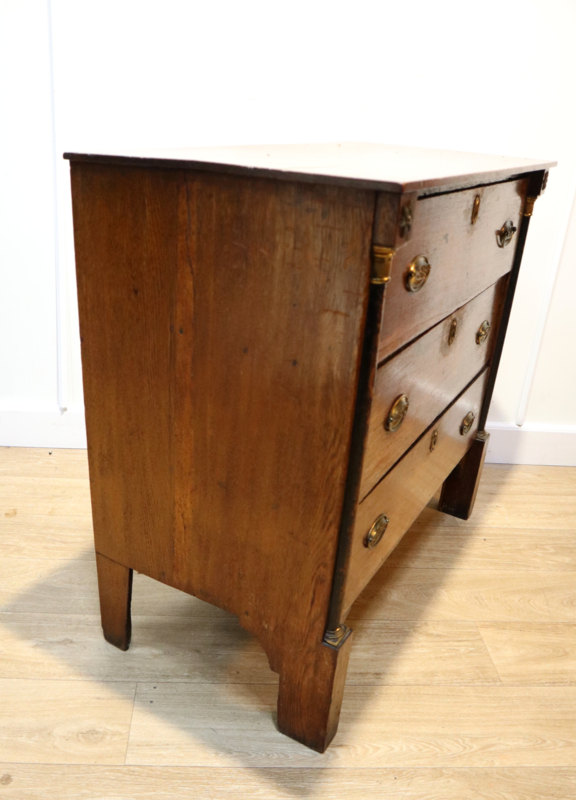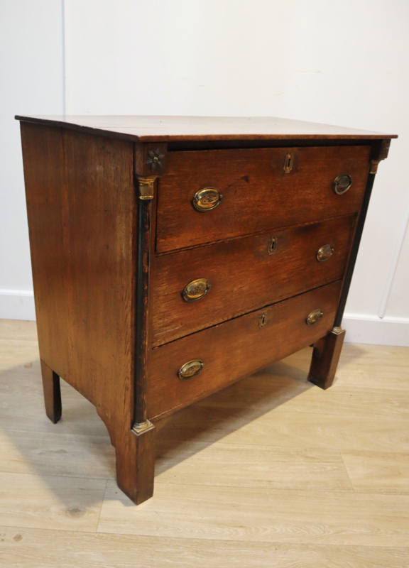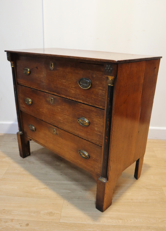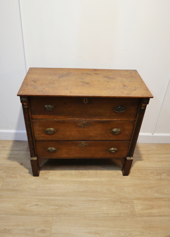 Leuk antiek Hollands ladekastje / commode met drie laden en aan weerszijden halve pilaren met messing manchetten, staande op originele blokpoten. De laden, die soepel op en dicht gaan, zijn voorzien van praktische koperen ladentrekkers (gebruikssporen). De pilaren hebben boven mooie sierelementjes. Door het niet al te grote formaat is deze kast makkelijk inpasbaar in ook wat kleinere ruimtes. Praktische en stijlvolle antieke kast met karakter! Eénvoudig en authentiek.