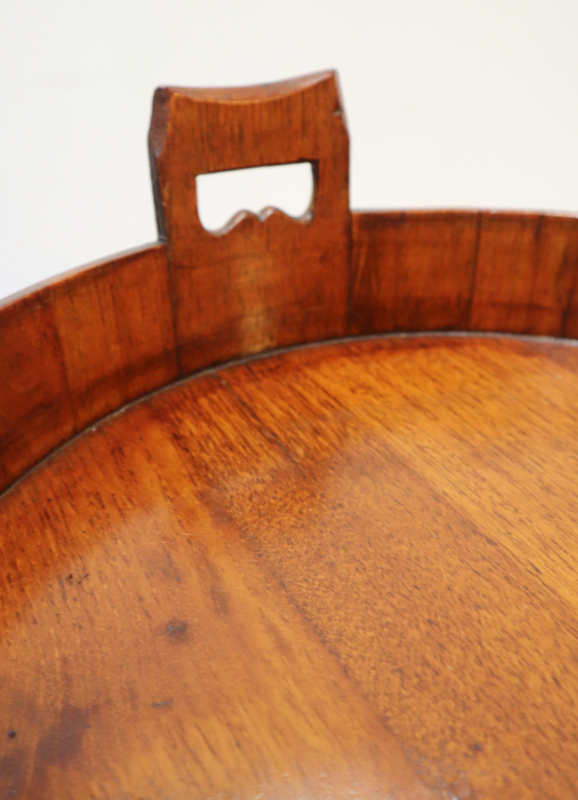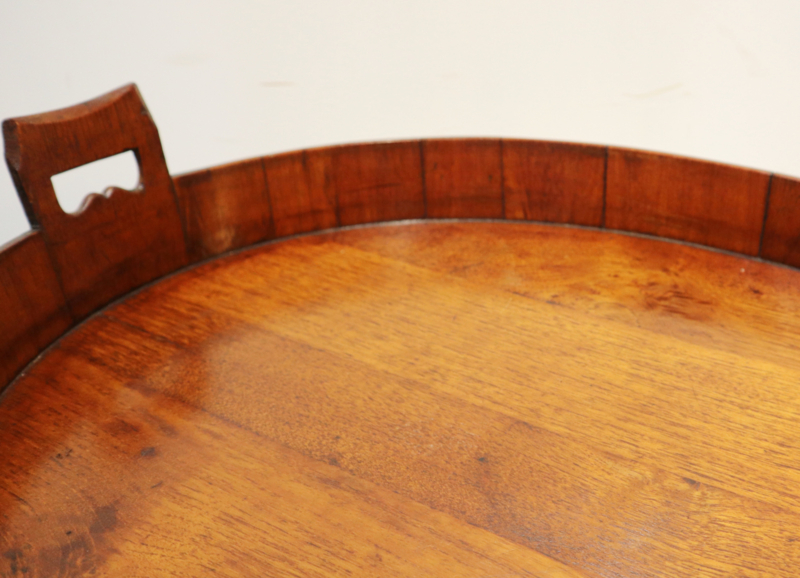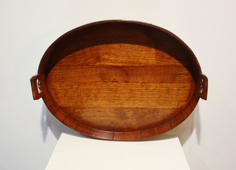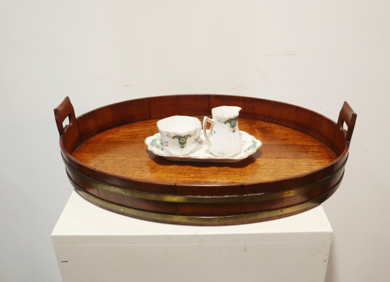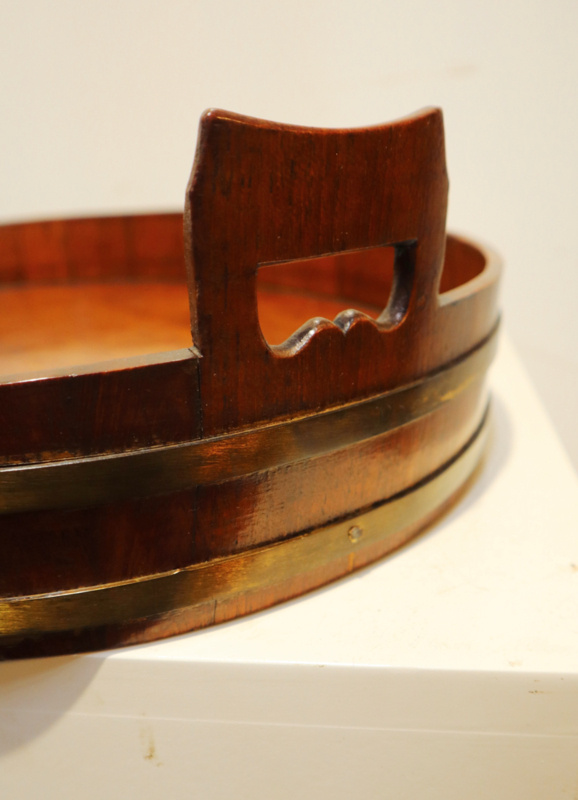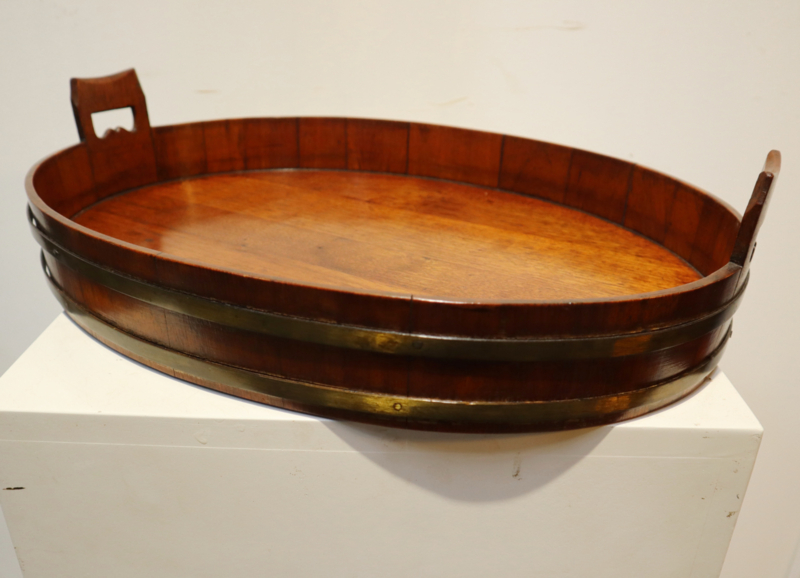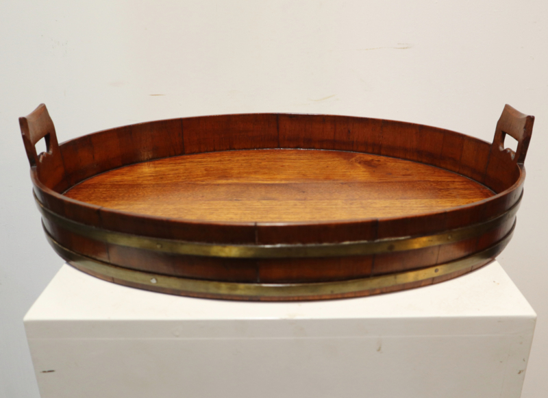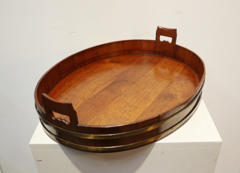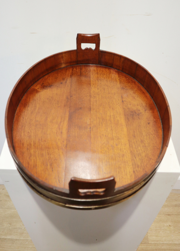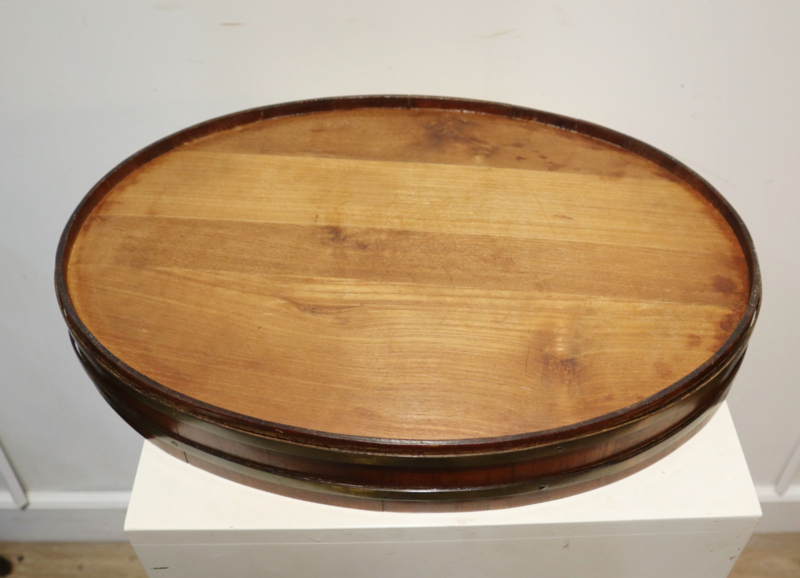 Zeer fraai antiek gekuipt dienblad met opstaande rand, twee open gewerkte handvatten en messing banden aan de buitenzijde. Dit dienblad, dat van goede kwaliteit is, is op traditionele wijze gemaakt met zogeheten duigen (zoals een wijnvat). Bijzonder is dat deze gemaakt is van eikenhout i.p.v mahoniehout. Decoratief en praktisch.