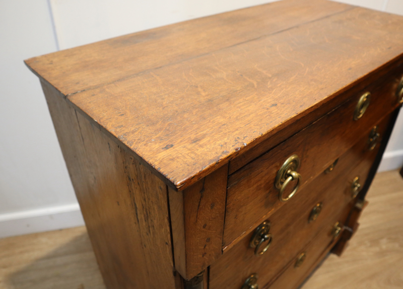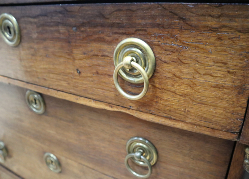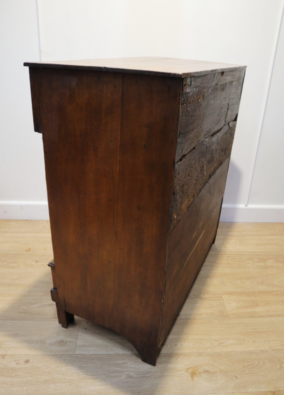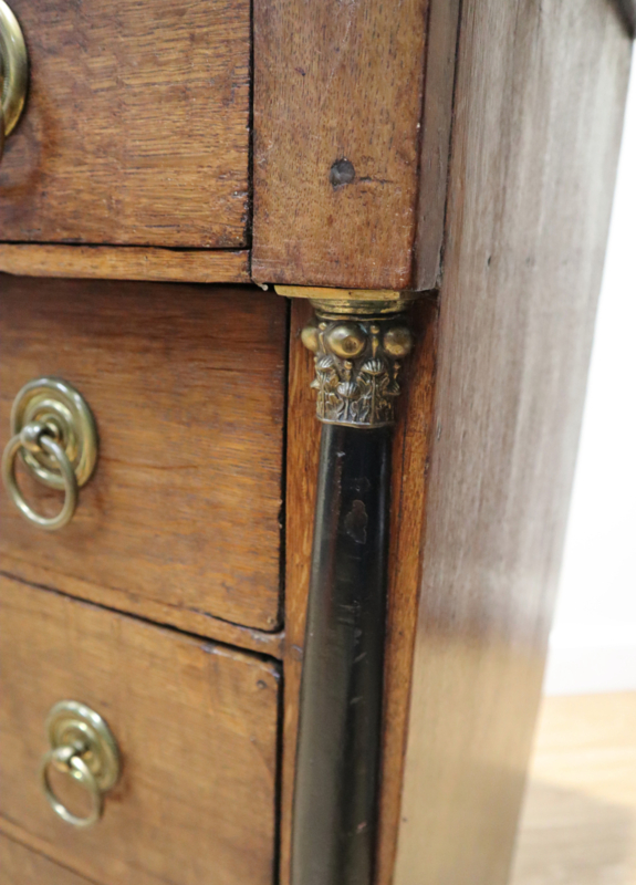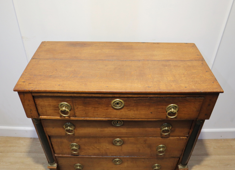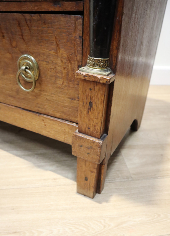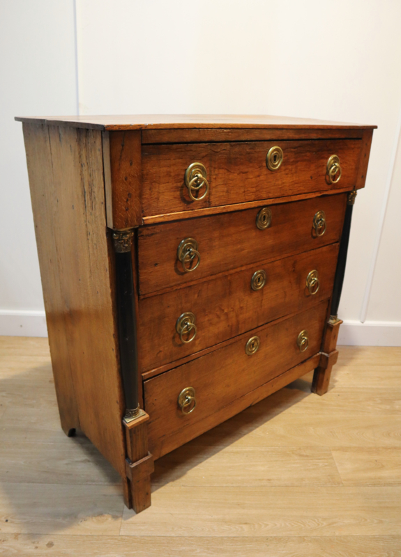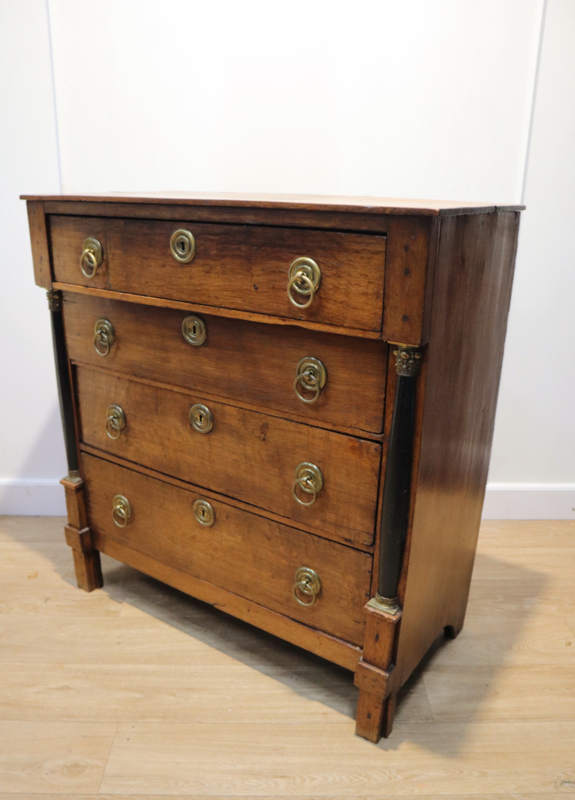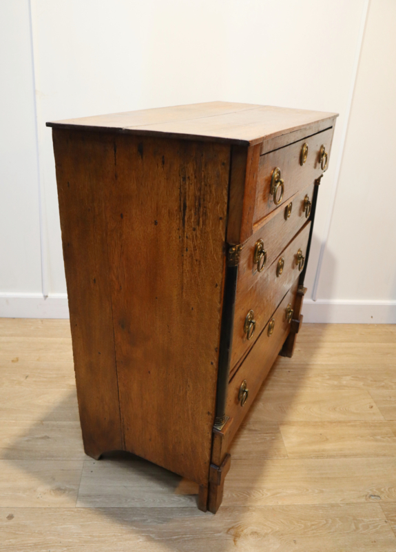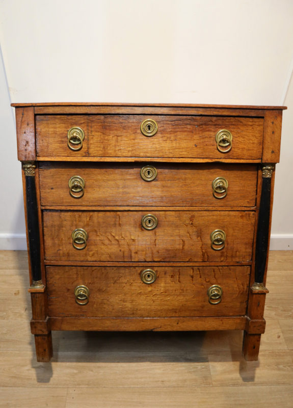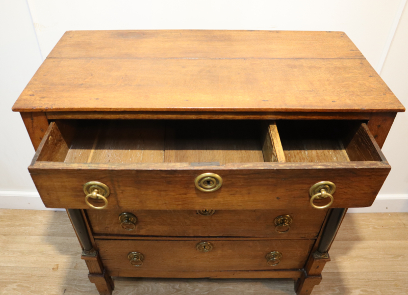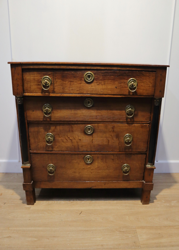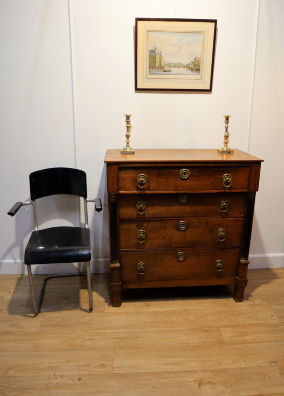 Fraaie antieke Hollandse ladekast / commode met vier laden en aan weerszijden zwartgelakte pilaren, staande op originele blokpoten. De laden, die soepel op en dicht gaan, zijn voorzien van authentiek koperen ringbeslag. De pilaren zijn boven en onder voorzien van mooie messing manchetten. Praktische en stijlvolle antieke kast met karakter.