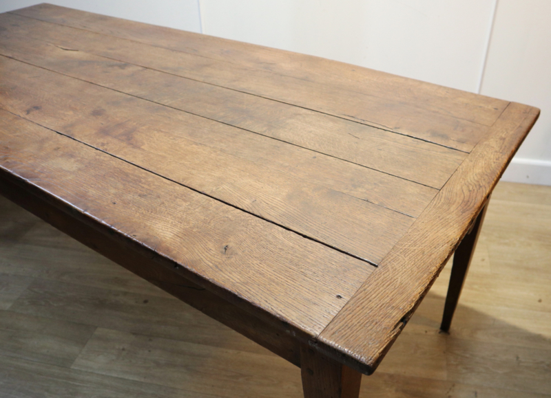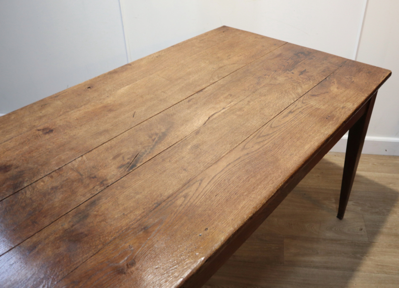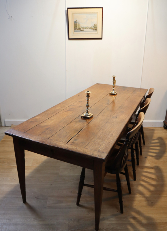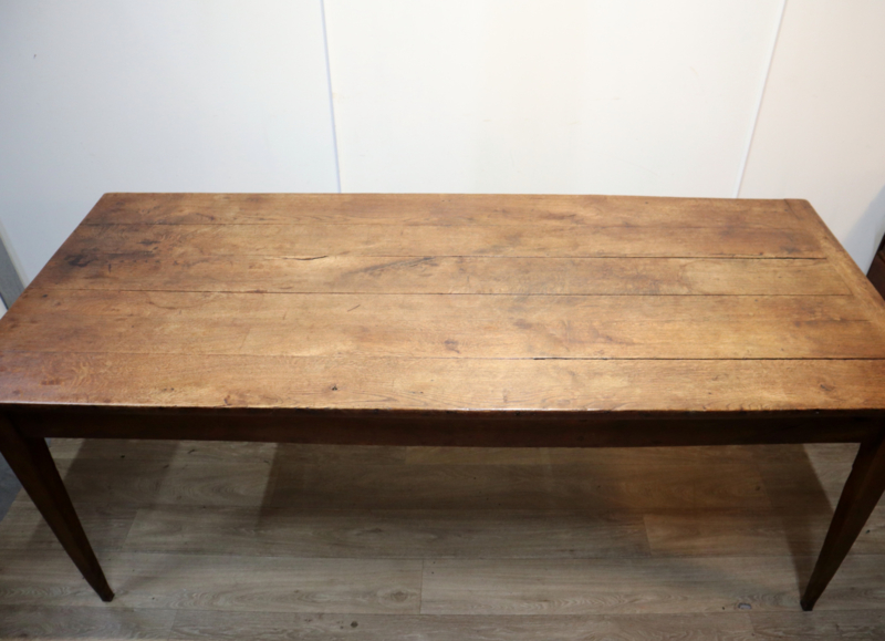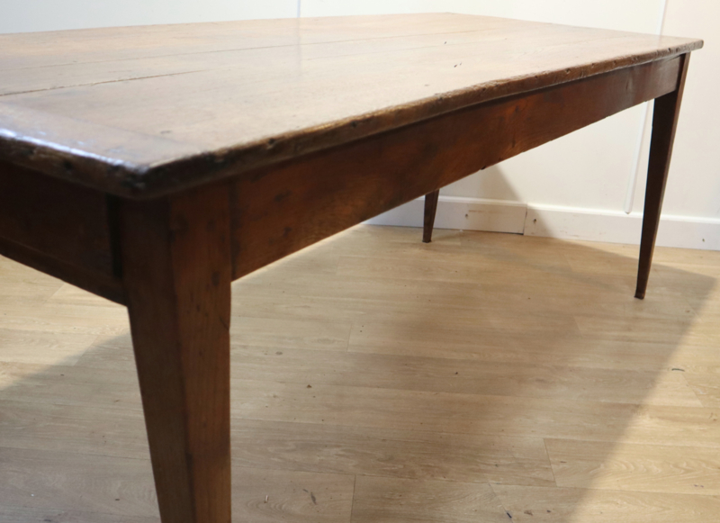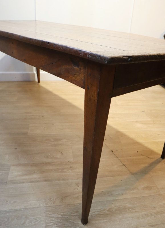 Mooie strakke antieke Franse boerentafel / eetkamertafel met grote lade aan de kopse kant, staande op tapstoelopende poten. Deze karaktervolle tafel heeft een aantrekkelijke "geleefde" en typisch landelijke uitstraling. Geschikt voor 6-8 personen. Voor een landelijke en sfeervolle uitstraling.
