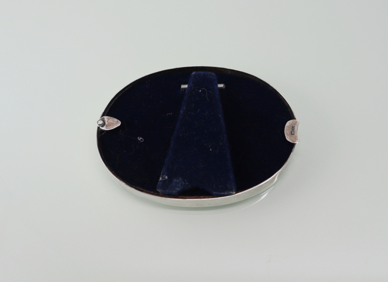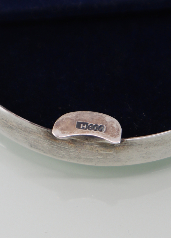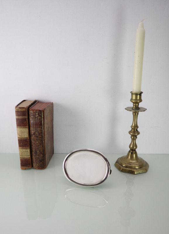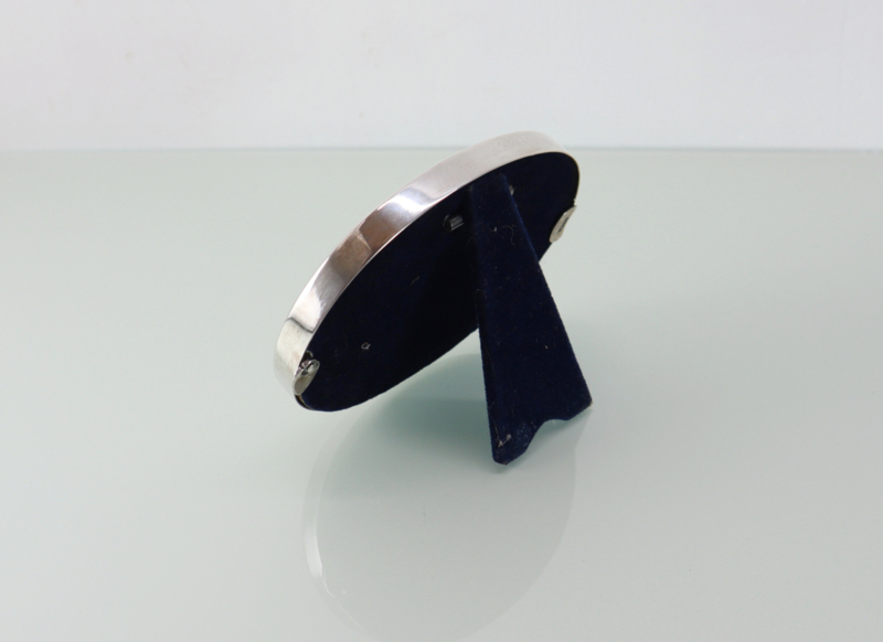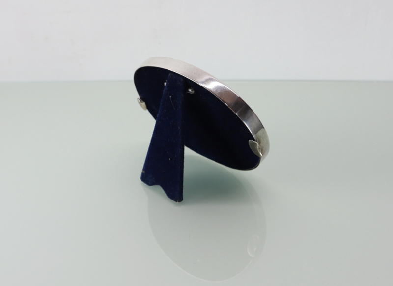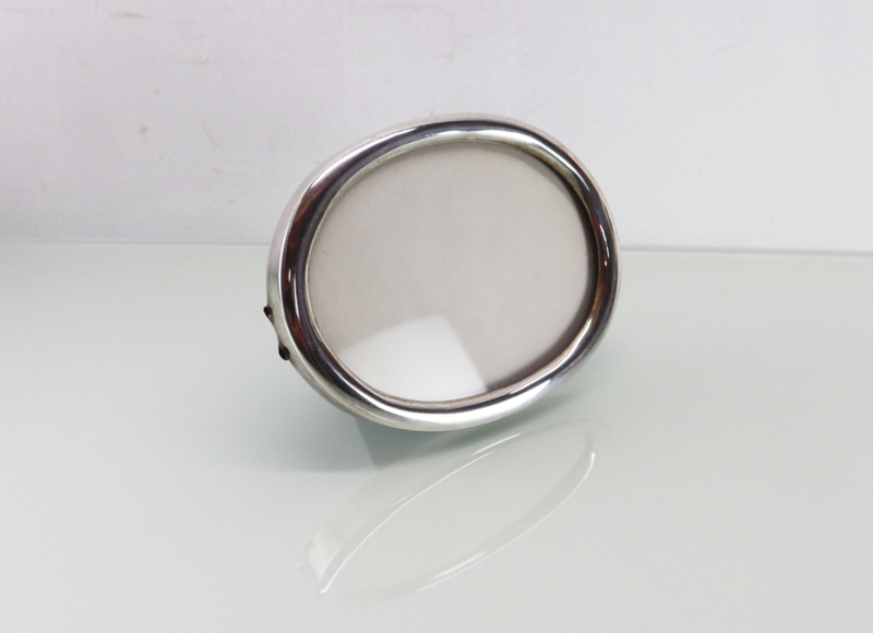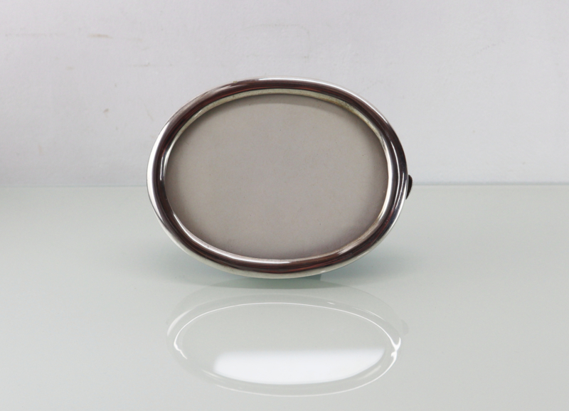 Mooie ovaal zilveren fotolijstje met gladde rand. Het heeft een gladde lijst van massief derde gehalte zilver en is gemerkt met H800. Eénvoudig aan de achterzijde te openen, compleet met glaasje. Zeer stijlvol.