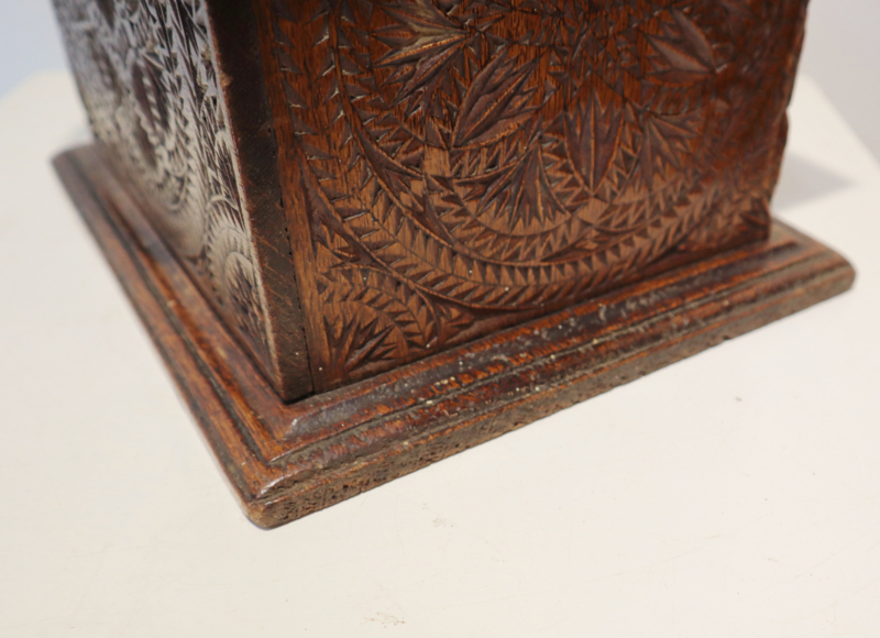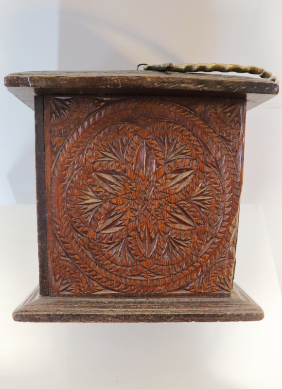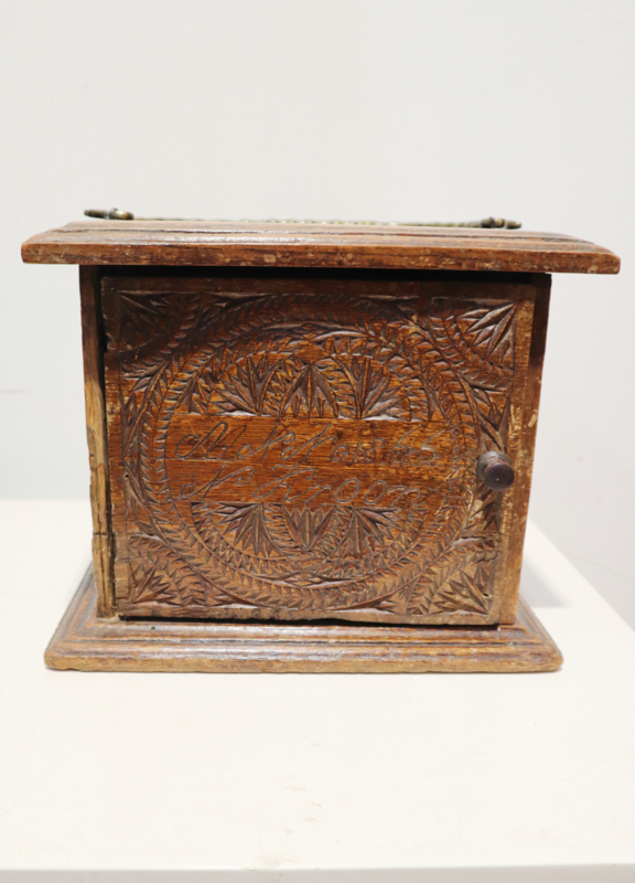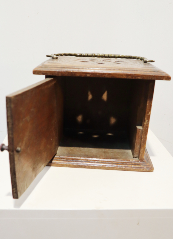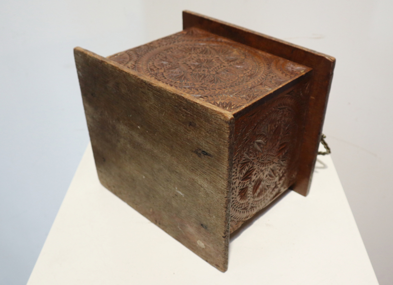 Mooie antieke voetenstoof met zeer fraaie Friese kerfsnede decoratie rondom met een deurtje en het originele messing hengsel. In het deurtje staat een datering Anno1866 en de naam N Kroon. De boven- en onderkant hebben een mooie geribbelde rand. Een mooi en zeer decoratief stukje volkskunst, maar kan bijvoorbeeld ook als voetenbankje gebruikt worden.