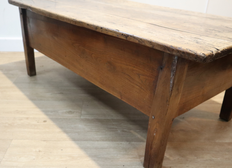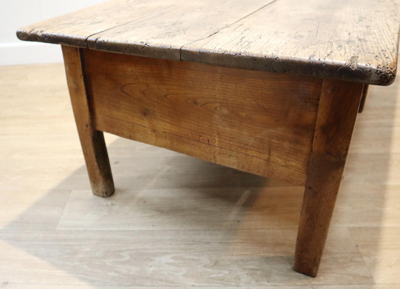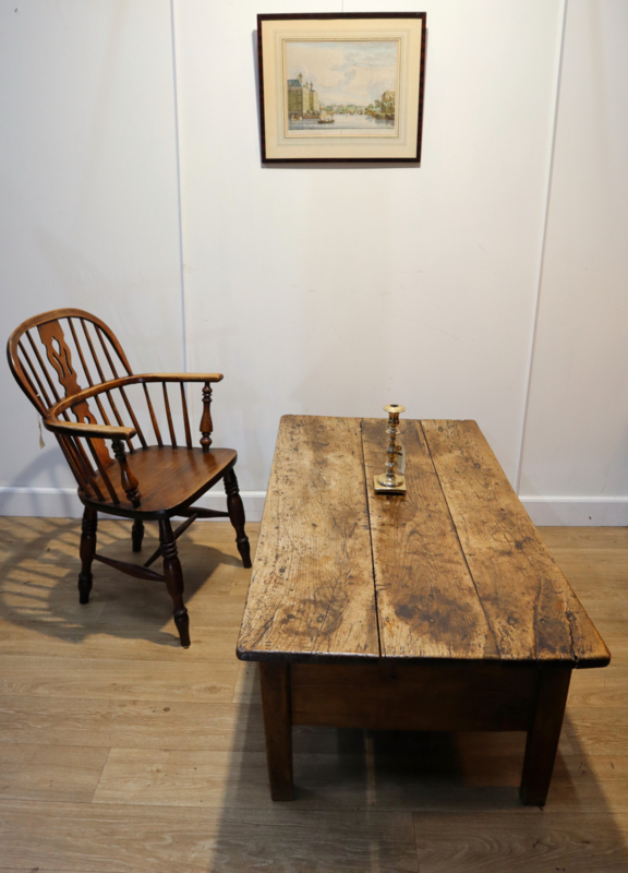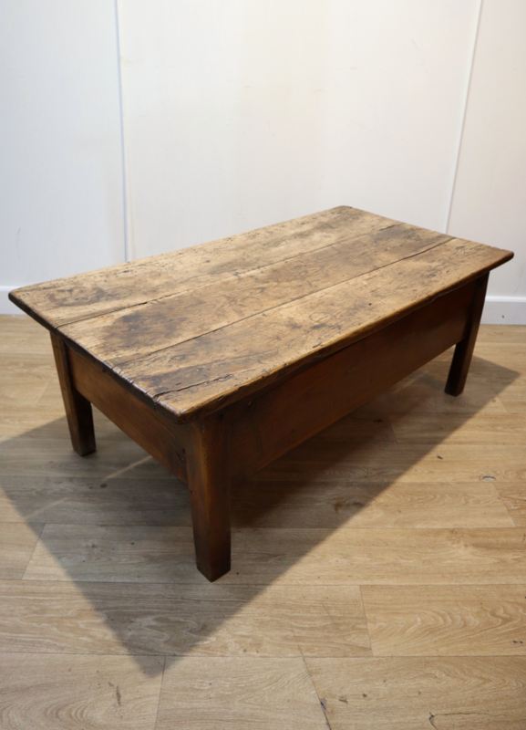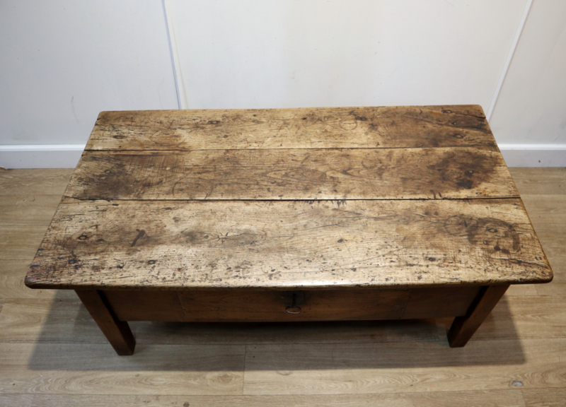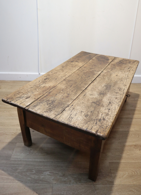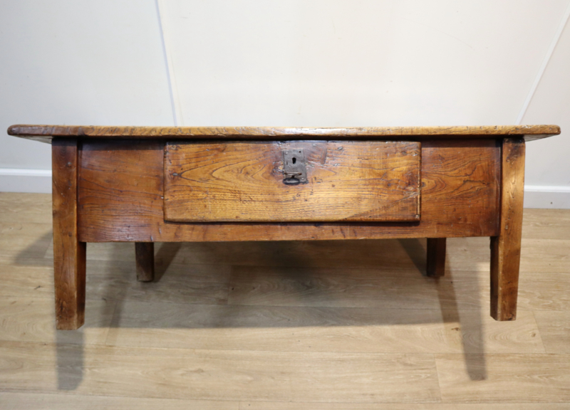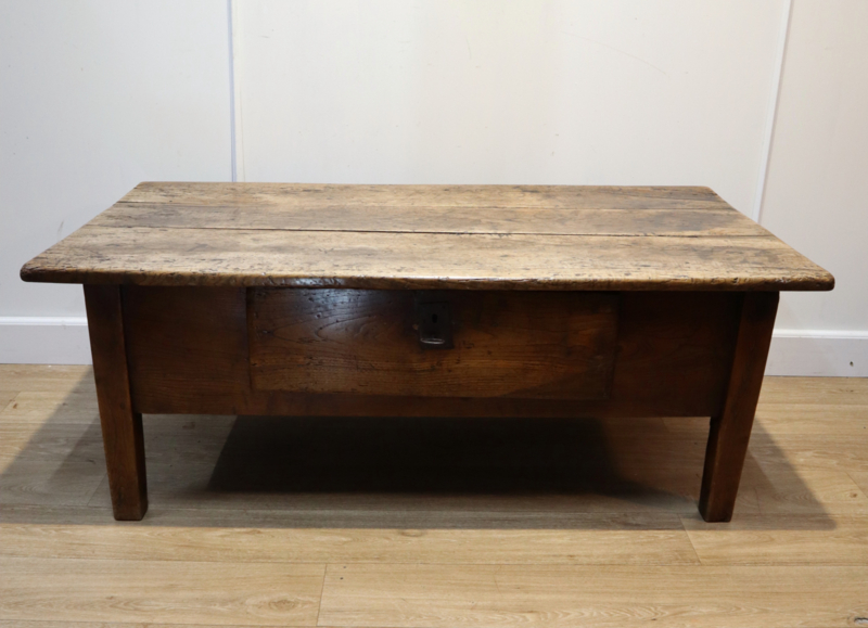 Fraaie antieke salontafel met 1 grote robuuste lade, staande op rechte poten. Deze stoere tafel heeft een prachtig "geleefd" blad met een zeer aantrekkelijk patina en warme kleur. Praktisch en karaktervol antiek meubel voor dagelijks gebruik. Door het niet al te grote formaat makkelijk inpasbaar. Een tafel met karakter en een landelijke uitstraling.