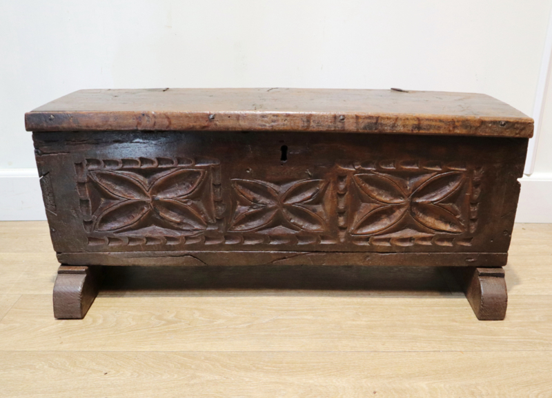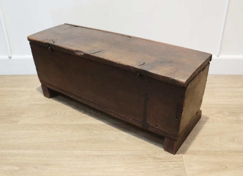 Mooi antiek documentenkistje met drie gestoken rozetten in het front, staande op slofpoten. Dit kistje is robuust gemaakt en heeft een stoere uitstraling en verkeert in een mooie conditie. Zeer decoratief en leuk om wat kleine spulletjes in op te bergen. Kan ook als bijvoorbeeld bijzettafeltje gebruikt worden.