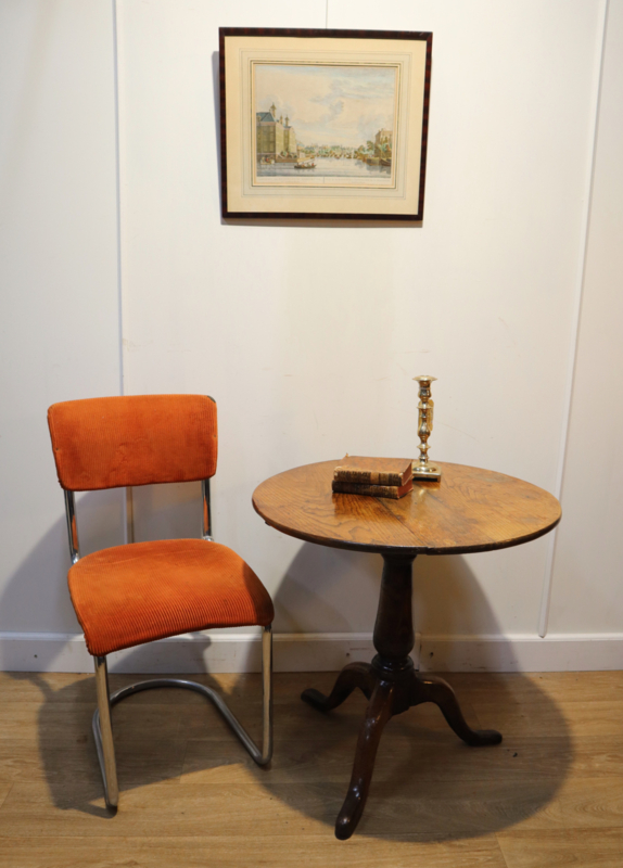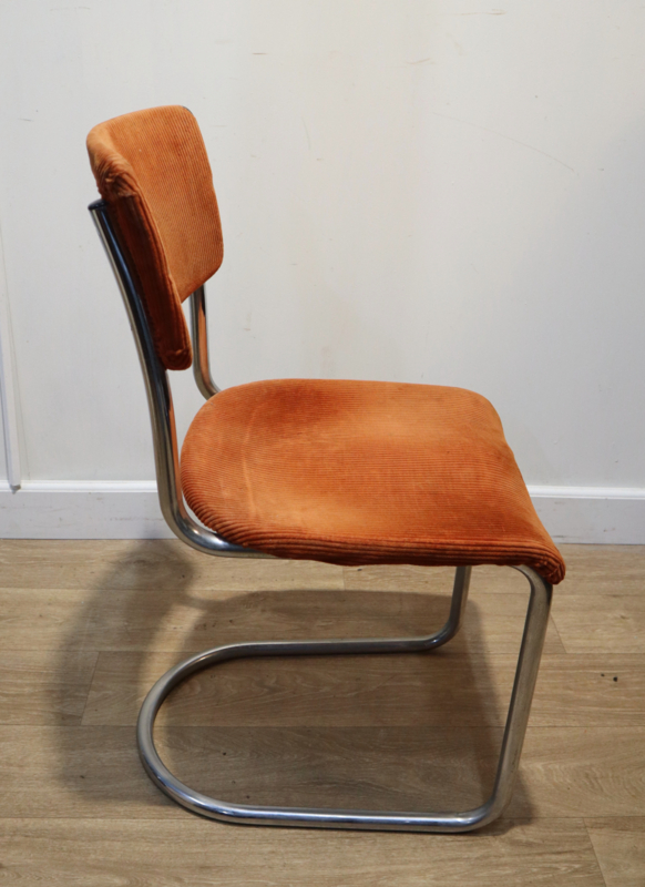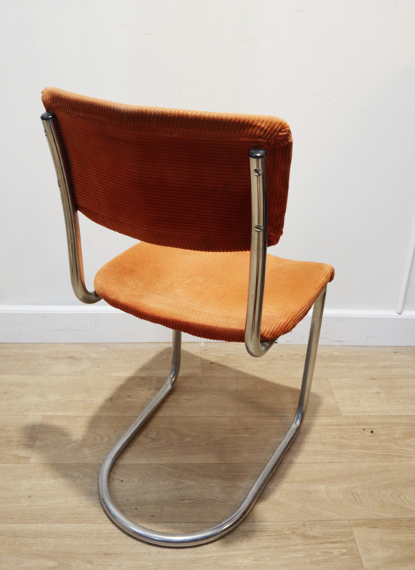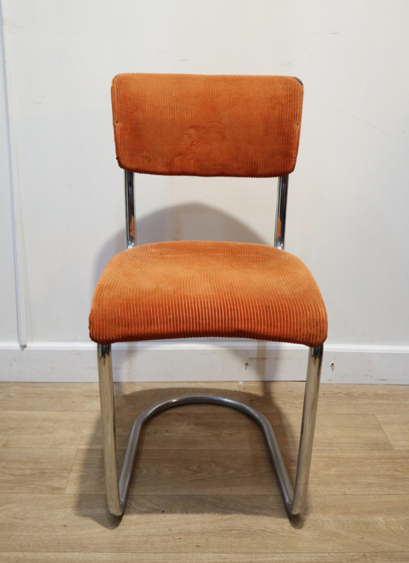 Leuke vintage (zwevend) buisframe stoel, bekleed met robuuste oranje ribstof. Deze stoel is mogelijk model 108 van de Nederlandse ontwerper WH Gispen. Het heeft een aantrekkelijke "minimalistisch" design en uitstraling, schoonheid door eenvoud en functionaliteit. De stoel verkeert in een mooie vintage staat (kleine beschadiging bekleding).