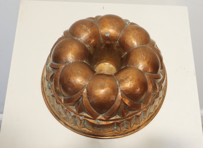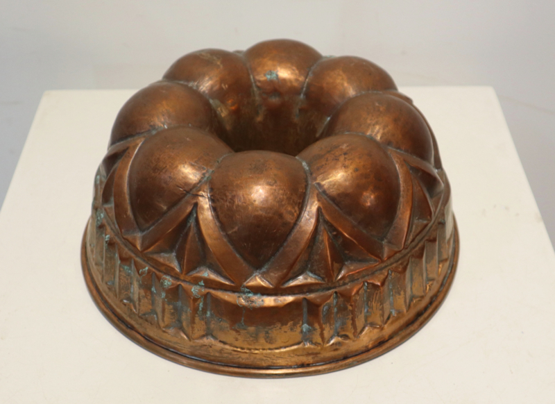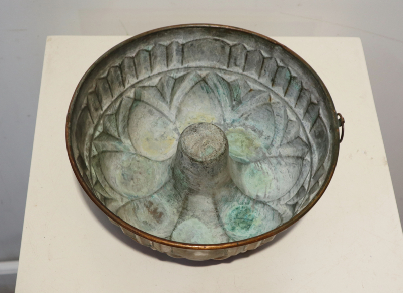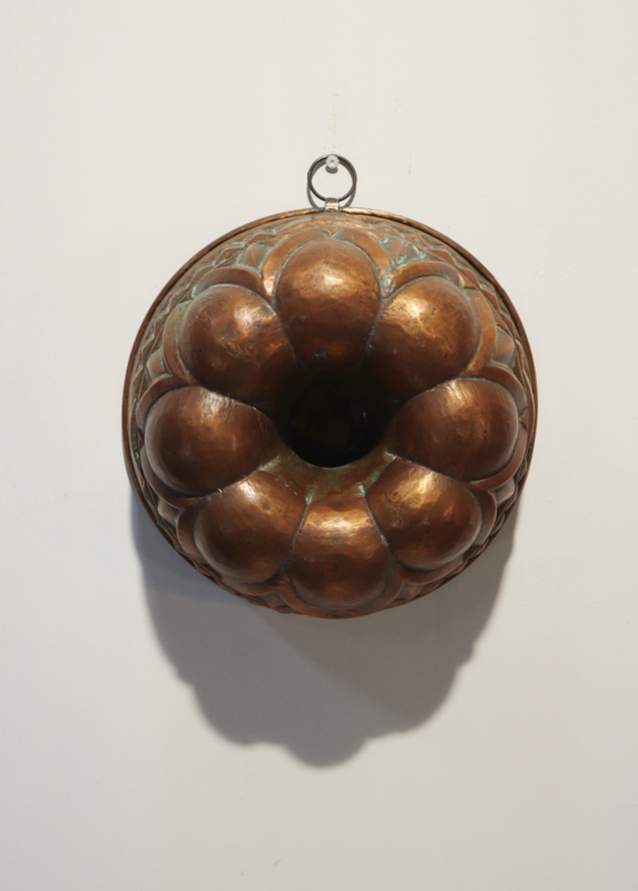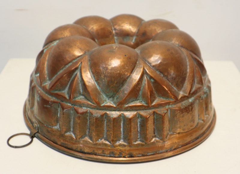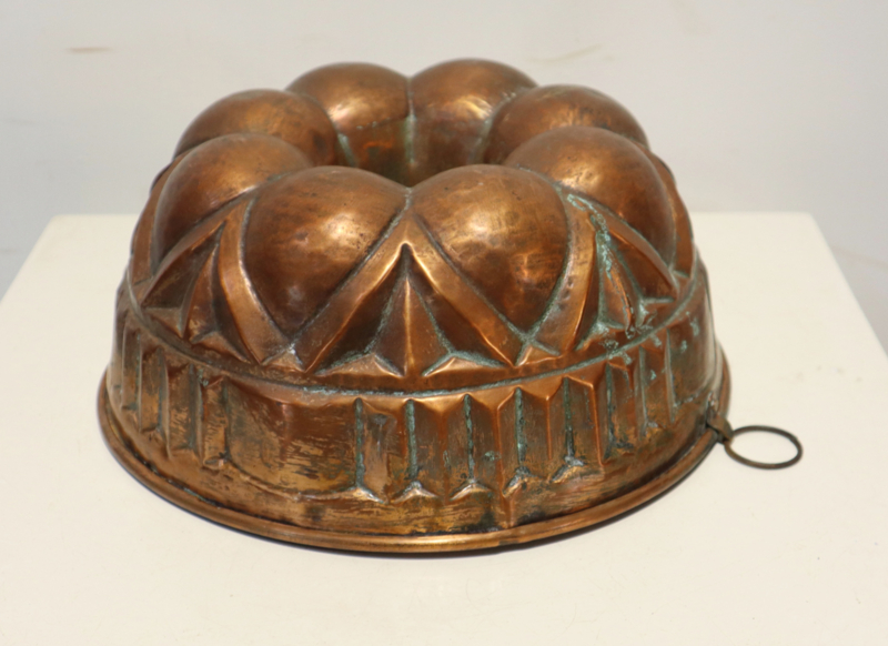 Mooie grote antieke roodkoperen puddingvorm/ tulband met een ophanghaakje, 19e eeuw. Het koper heeft een aantrekkelijk patina. Leuk en decoratief om in uw keuken op te hangen.