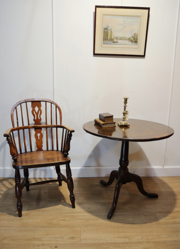 Elegante antieke Engelse tilttoptafel (bijzettafel), staande op een fraai gedraaide kolom met driepoot. Zowel het blad en zeker de driepoot hebben een zeer aantrekkelijk patine. Geschikt als bijzettafeltje (om een glas wijn op te zetten) bij bijvoorbeeld een fauteuil. Zeer decoratief en stijlvol. Voor een landelijke "Country House" uitstraling.