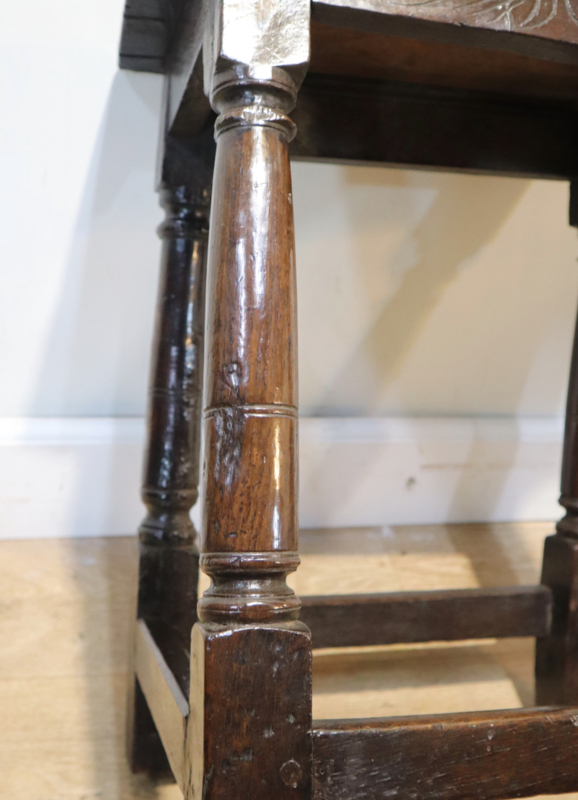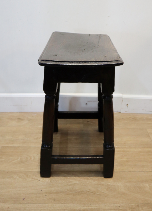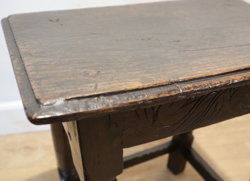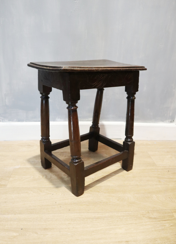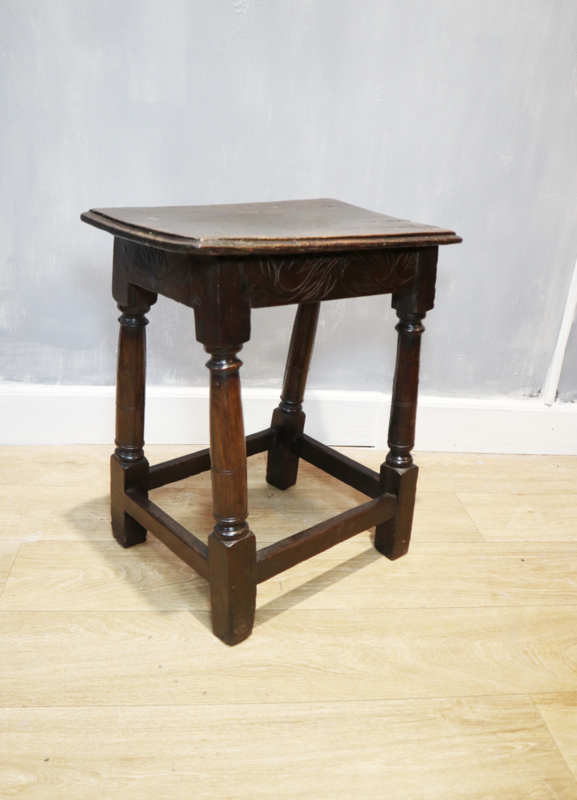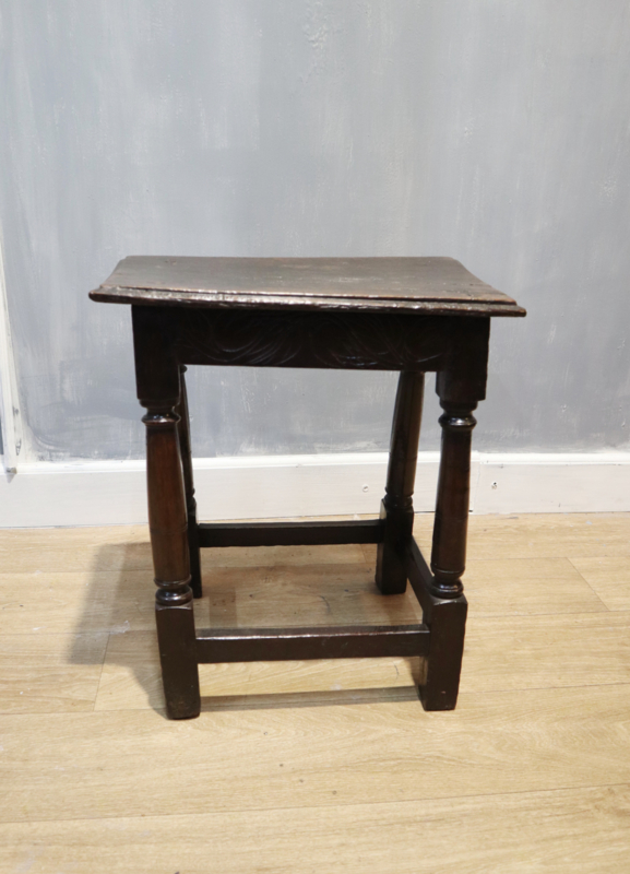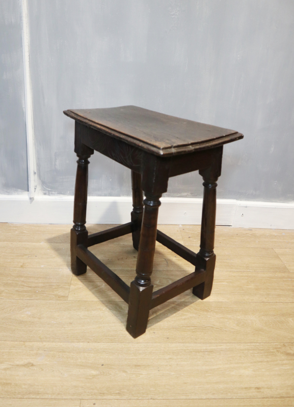 Fraai origineel antiek Engels krukje, ook wel Joint Stool genoemd, met gedraaide poten die onderling verbonden zijn met regels. In de friezen is een eenvoudig snijwerk aangebracht. Dit krukje kan gebruikt worden om op te zitten maar kan ook heel goed als klein bijzettafeltje gebruikt worden. Een zeer decoratief en praktisch meubel uit de 17e eeuw!