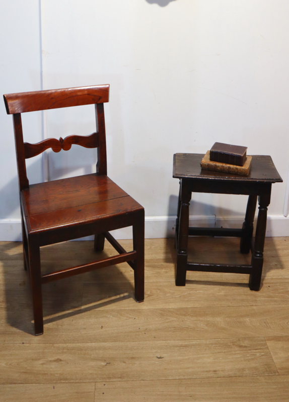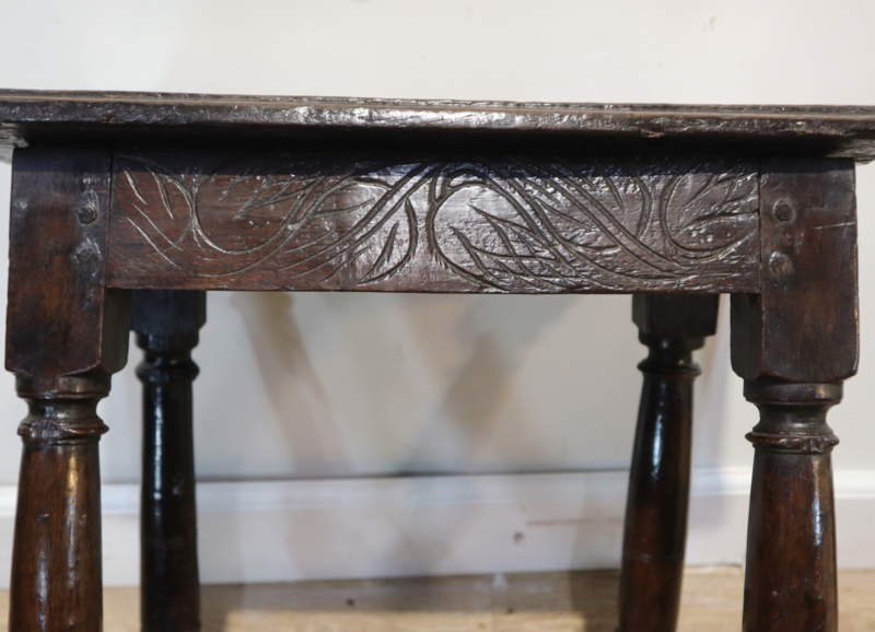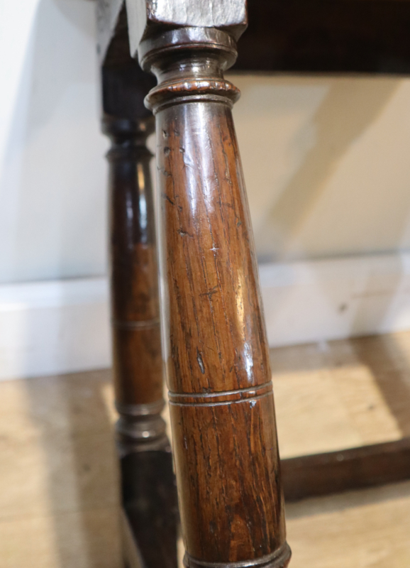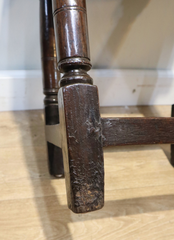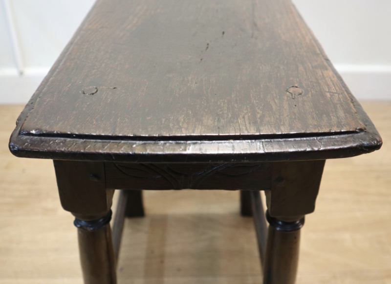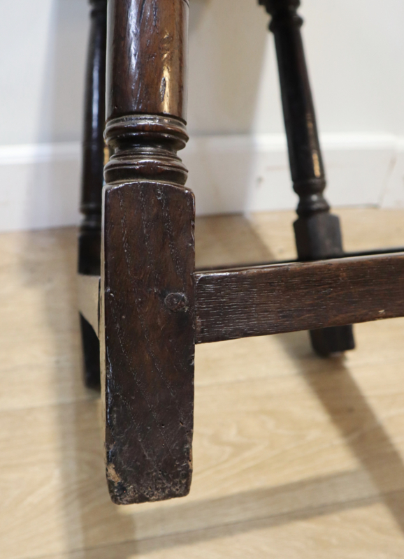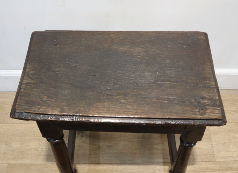 Fraai origineel antiek Engels krukje, ook wel Joint Stool genoemd, met gedraaide poten die onderling verbonden zijn met regels. In de friezen is een eenvoudig snijwerk aangebracht. Dit krukje kan gebruikt worden om op te zitten maar kan ook heel goed als klein bijzettafeltje gebruikt worden. Een zeer decoratief en praktisch meubel uit de 17e eeuw!