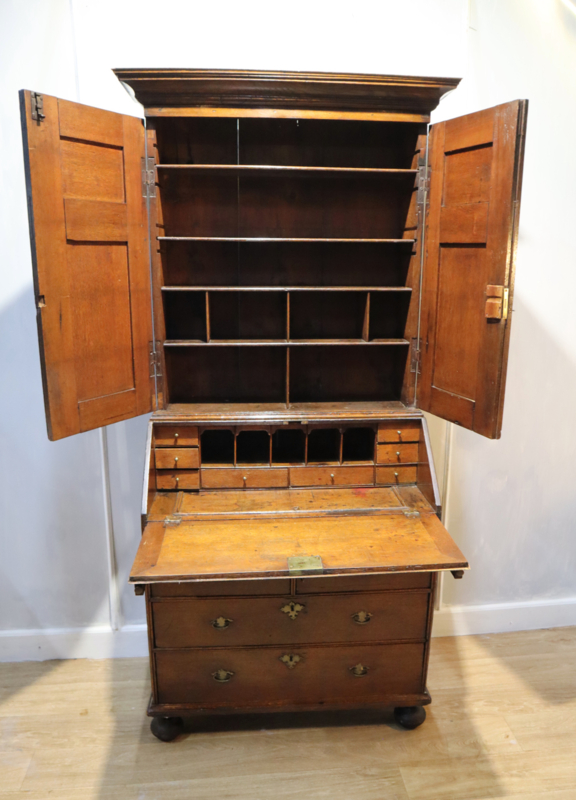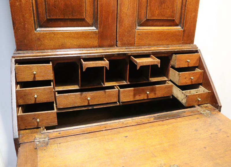 Fraaie antieke secretaire / topbureau (booccase) met opstand en daarboven een mooie strakke kap. De onderkast heeft twee grote laden en 2 kleine laden, voorzien van authentieke messing zwanenhals ladentrekkers. Aan de binnenkant zitten er diverse laadjes, vakjes en een zogenaamd keldertje. De bovenkast heeft twee deuren met panelen en aan de binnenkant zitten vier planken waarvan er twee in hoogte verstelbaar zijn. Stijlvolle kast van mooie kwaliteit met veel bergruimte.