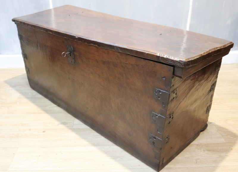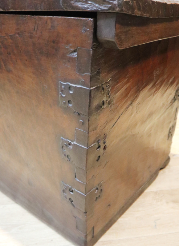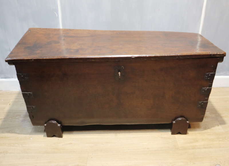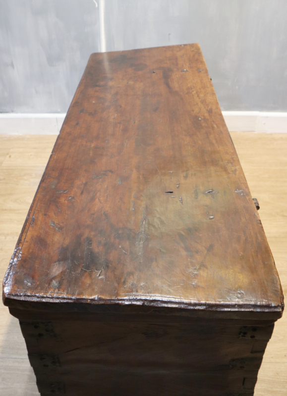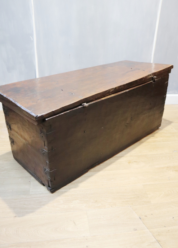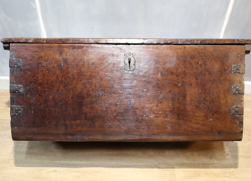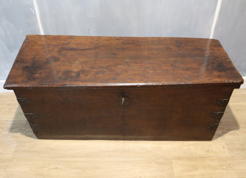 Robuuste antieke Spaanse kist met mooie originele metalen beschermhoeken, origineel slot (sleutel draait niet) en slotplaat. Deze kist is geheel gemaakt uit 1 stuk hout. Het deksel is met de jaren gebogen, dat de kist extra karakter geeft (sluit goed). Een kist met geschiedenis en karakter! Eventueel met bijpassende slofffen.