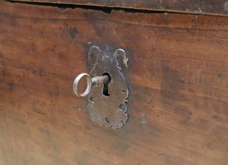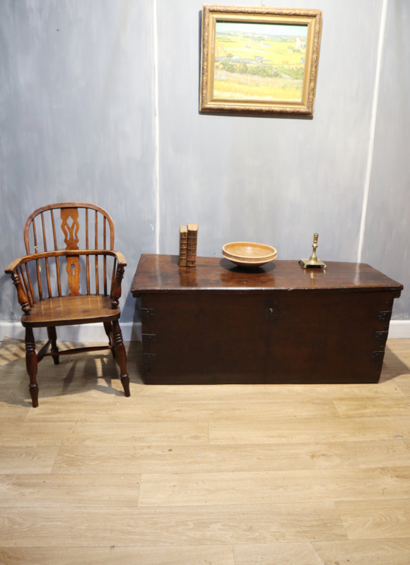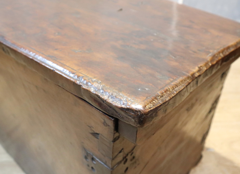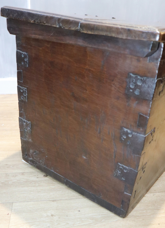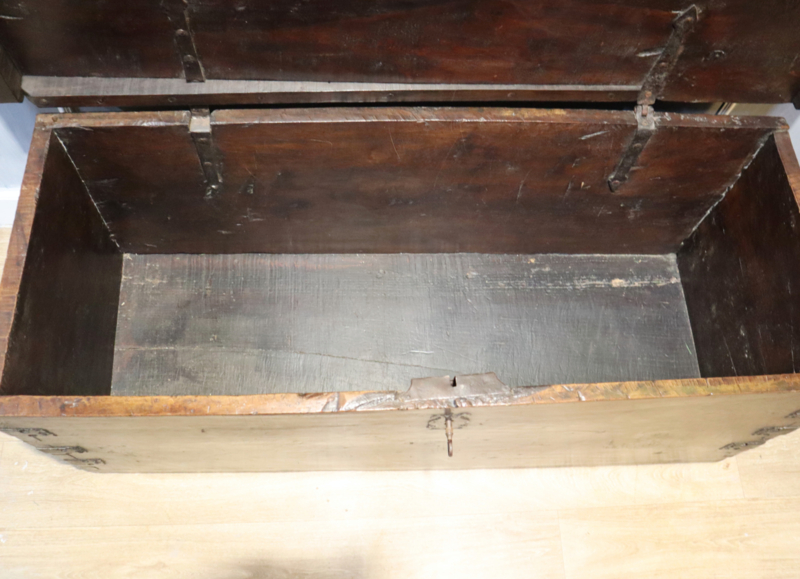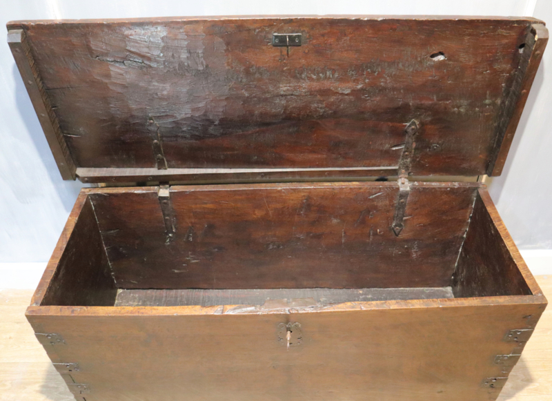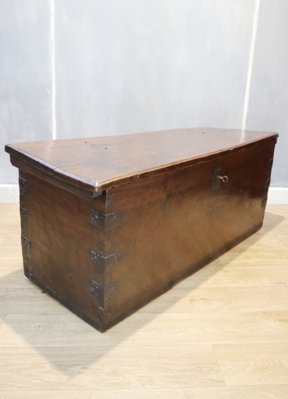 Robuuste antieke Spaanse kist met mooie originele metalen beschermhoeken, origineel slot (sleutel draait niet) en slotplaat. Deze kist is geheel gemaakt uit 1 stuk hout. Het deksel is met de jaren gebogen, dat de kist extra karakter geeft (sluit goed). Een kist met geschiedenis en karakter! Eventueel met bijpassende slofffen.