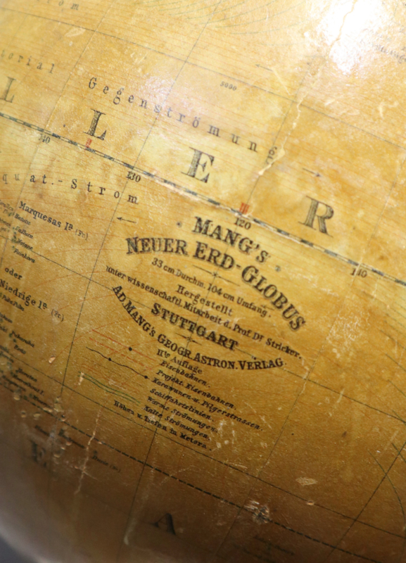 Mooie antieke globe / wereldbol op mooie houten voet, uitgegeven door Mang's Stüttgart / professor Stricker. De globe dateert uit ca. 1896-1900. (Rodesië is vermeld, Cook Islands is nog van Groot Brittanië). Deze globe draait goed rond, is Duitstalig en past goed op bijvoorbeeld een bureau. Zeer decoratief en een leuke blik in het verleden.