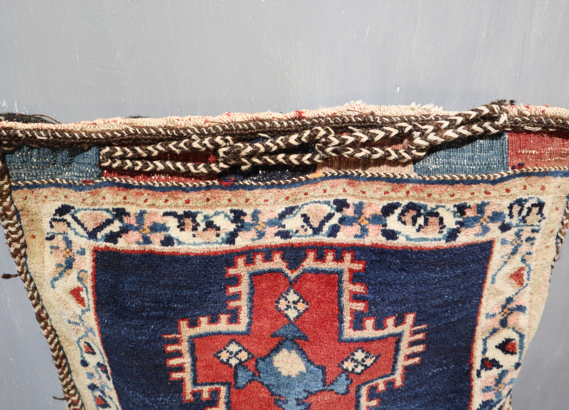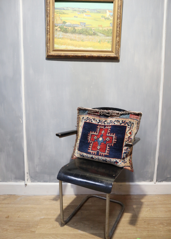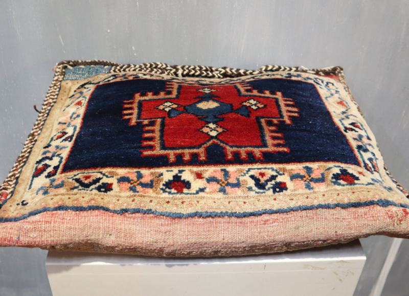 Fraai authentiek Perzisch/Oosters kussen type Afshar met een aantrekkelijk patroon en heldere kleuren, type Afshar. Compleet met nieuw vullend kussen (dichtgenaaid) en originele kelim achterkant. Zeer decoratief.
