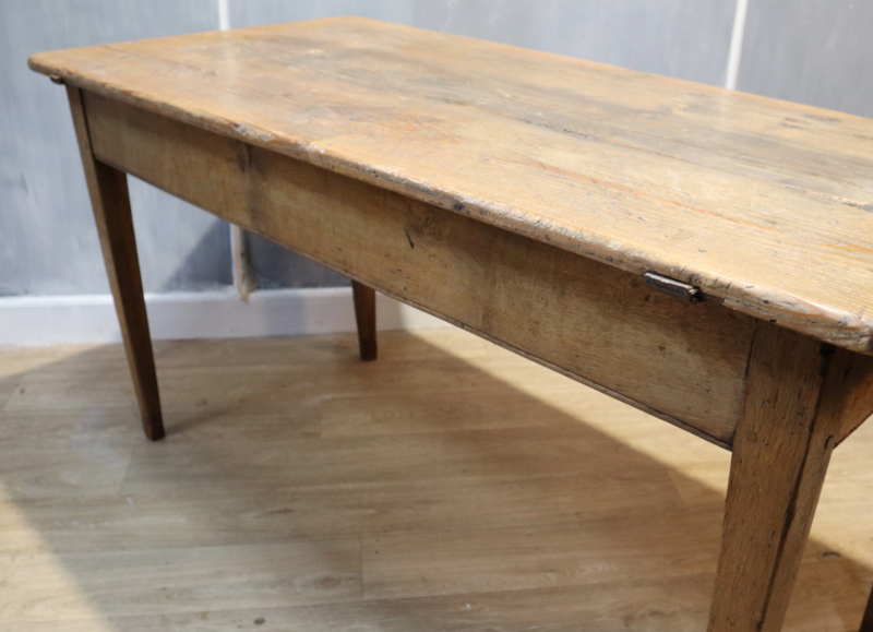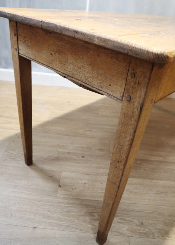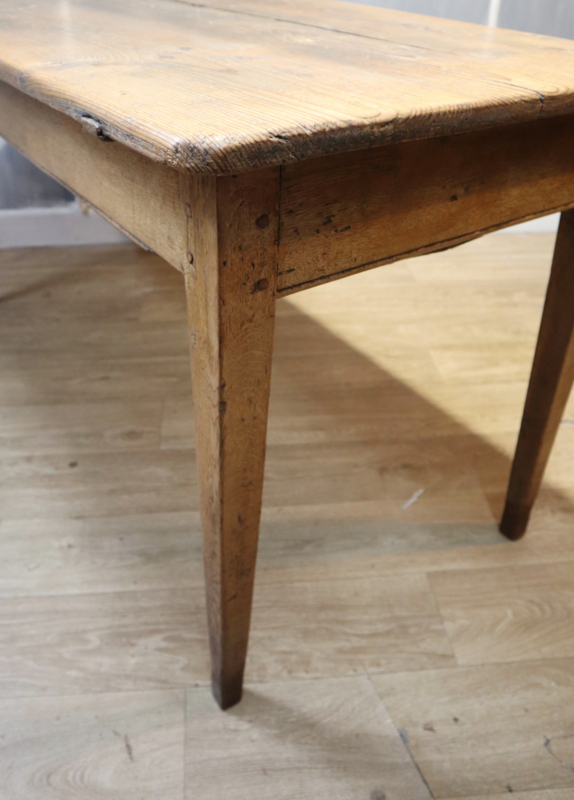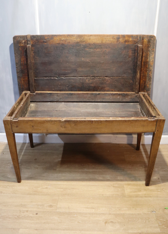 Leuke antieke Franse bakkerstafel met onder het blad (los) een zogenaamde trog, staande op iets tapstoelopende poten. Oorspronkelijk zijn dit type tafels werktafels voor in een bakkerij en werd in de trog het deeg verwerkt en/of stokbrood in bewaard. Nu vooral handig om wat kleine items in op te bergen. Deze tafel heeft een aantrekkelijke "geleefde" en typisch Franse landelijke uitstraling. Geschikt als kleine eettafel of keukentafel. Voor een warme landelijke uitstraling.