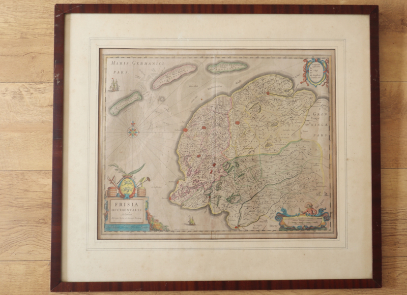 Mooie antieke in de tijd gekleurde kaart / gravure van Friesland (Oost Friesland), uitgegeven in Amsterdam in ca. 1629 door Henricus Hondius (1597-1651) naar landmetingen van Adriaan Metius en Gerard Freitag . Getiteld: "Frisia Occidentalis". Afkomstig uit een Nederlandstalige Mercator Hondius atlas. Linksonder het titelcartouche en provinciewapen, rechtsboven een legenda en rechtsonder een cartouche met schaalstokken. Deze kaart is ingelijst met passe-partout.