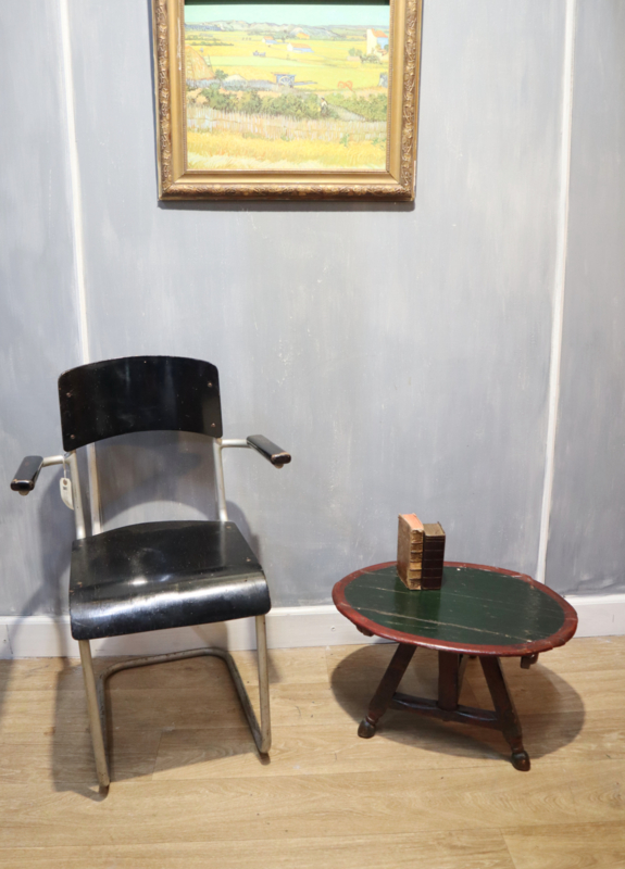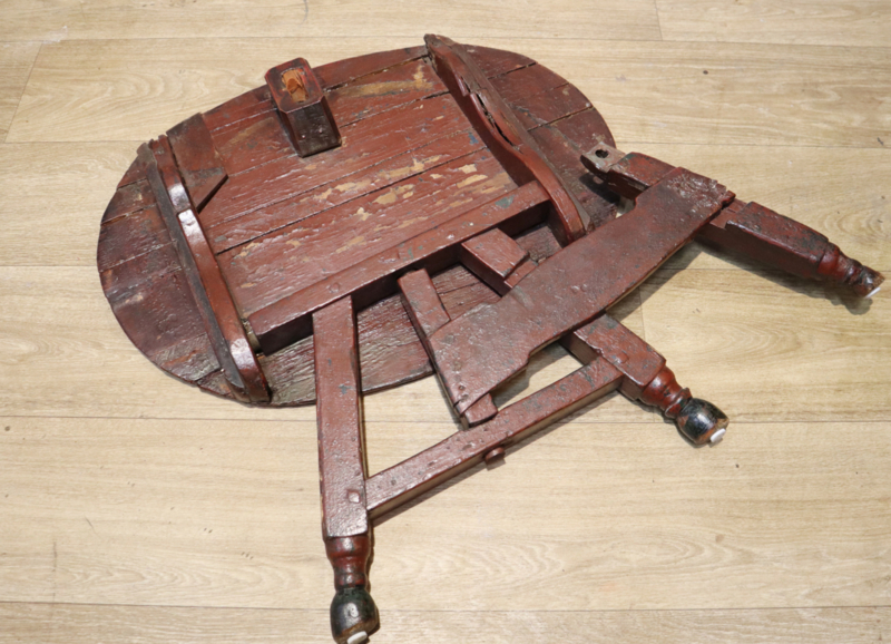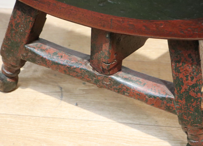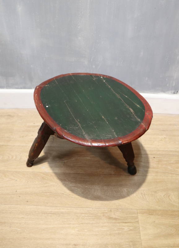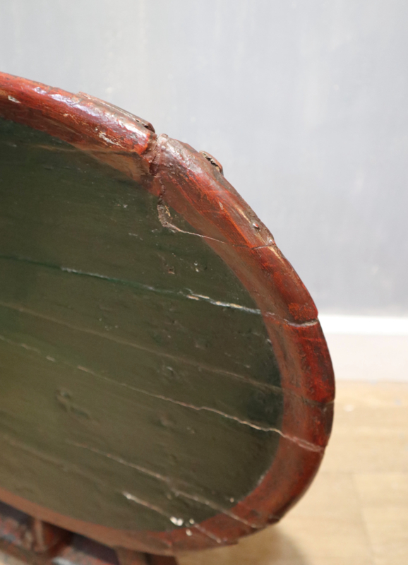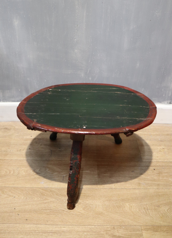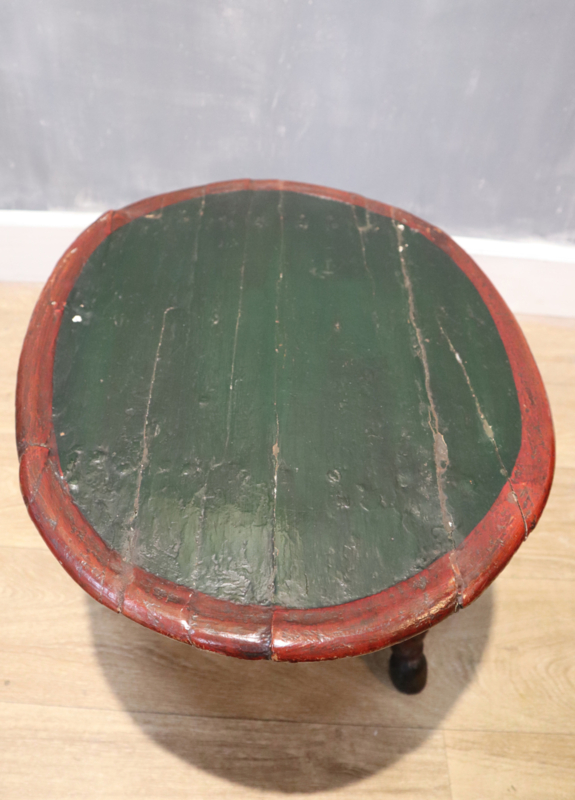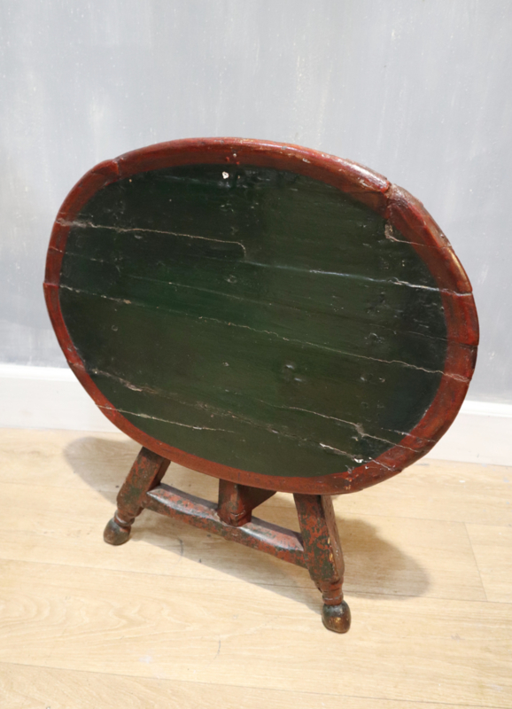 Leuke antiek miniatuur zogenaamd flap-aan-de-wand tafeltje (klaptafeltje). Dit tafeltje is geheel beschilderd en heeft meerdere lagen oude verf van groen en rood. Vroeger werden deze tafels gebruikt als eettafel en werden ze na de maaltijd opgeklapt en tegen de muur gezet om zo ruimte te besparen. Dit tafeltje is mogelijk een meesterstukje of gemaakt voor kinderen om mee te spelen. Leuk om te gebruiken als klein bijzettafeltje en tevens een decoratief (verzamel) item.