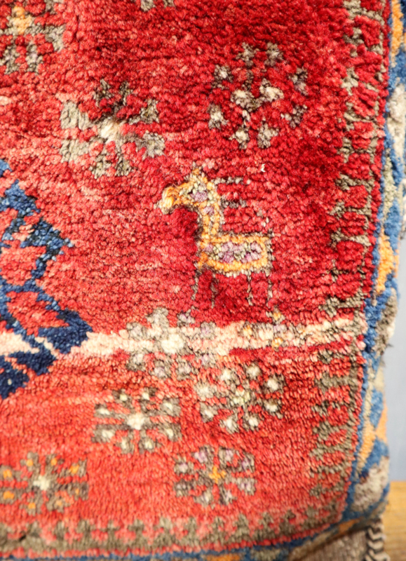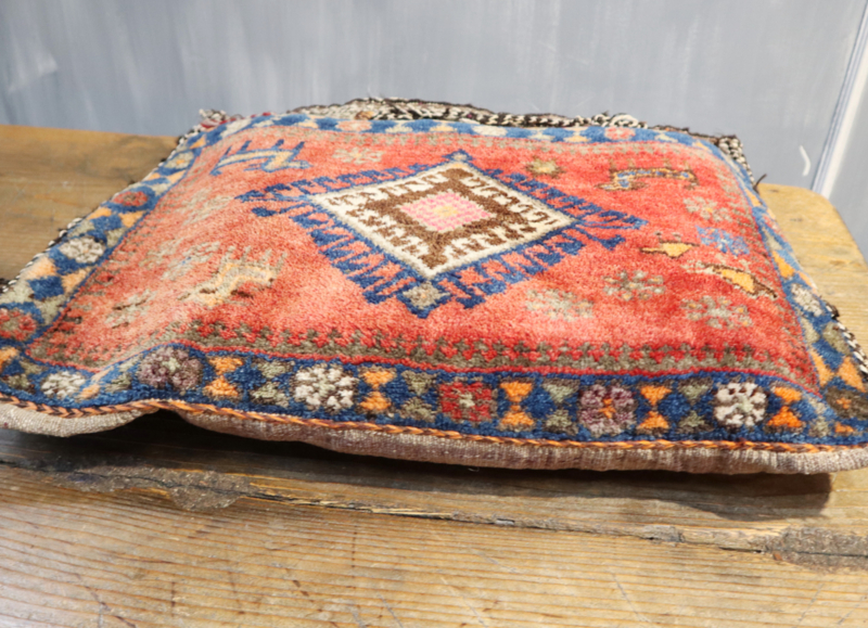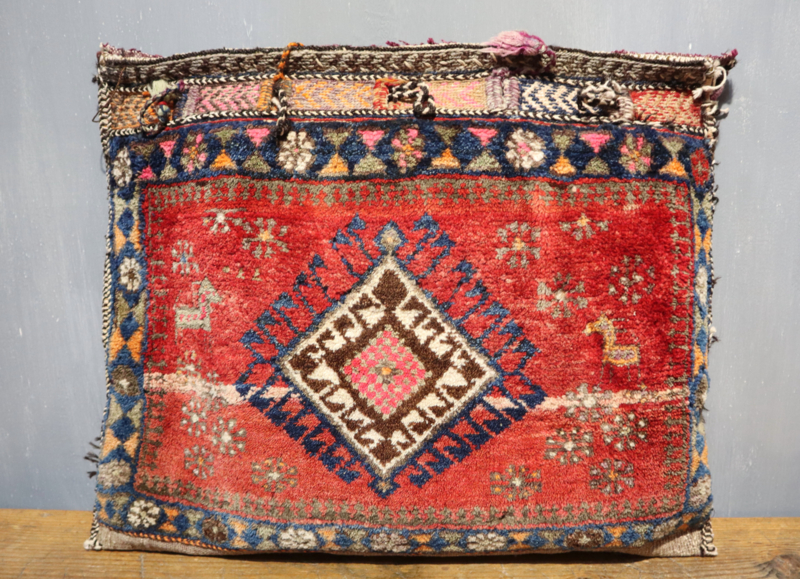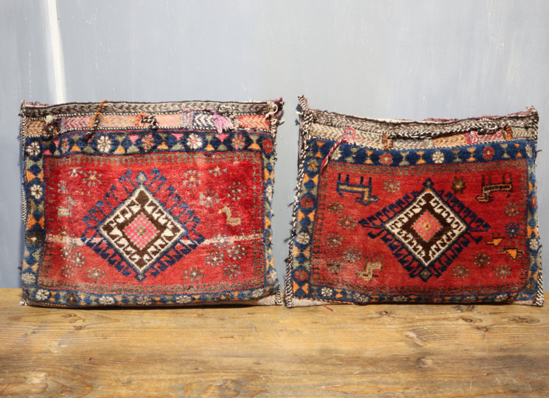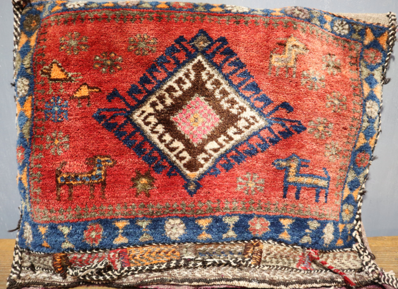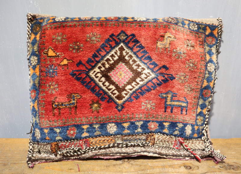 Een leuke set Perzische kussens met aantrekkelijk en kleurrijk decor met onder andere dierfiguren (paarden), type Afshar. Deze authentieke kussens zijn dichtgenaaid maar hebben nog wel een traditionele sluiting, compleet met binnenkussens. Zeer decoratief en leuk voor bijvoorbeeld een tuinbank. Zeer decoratief.