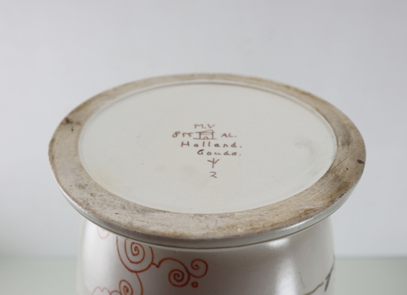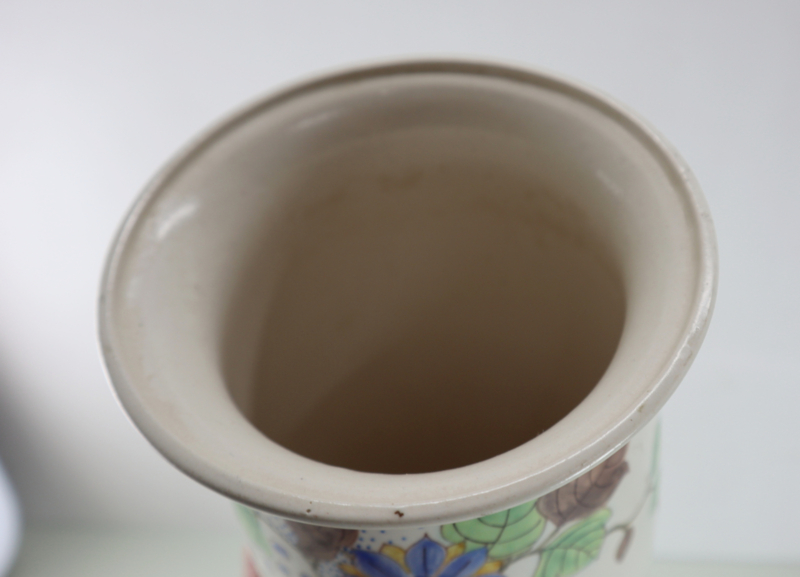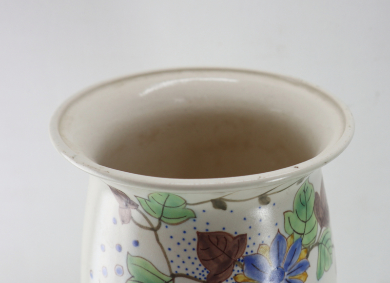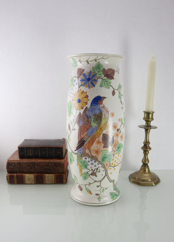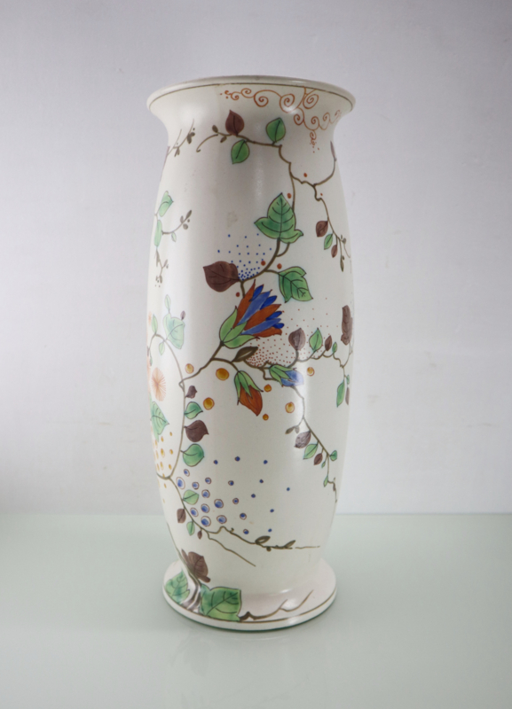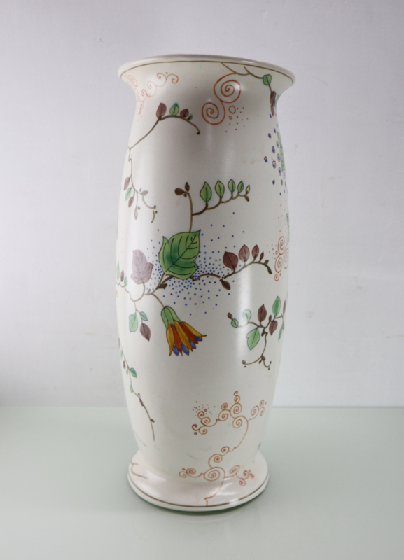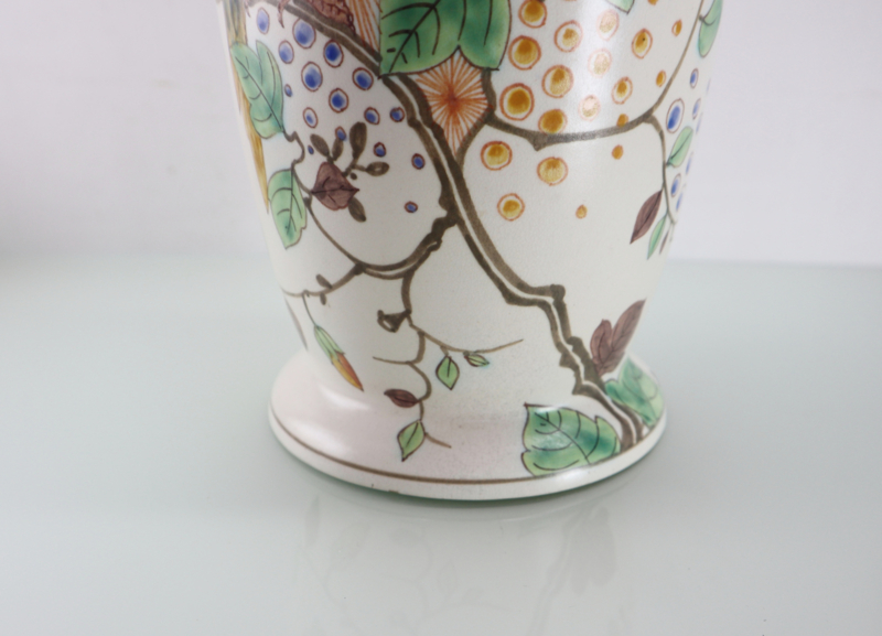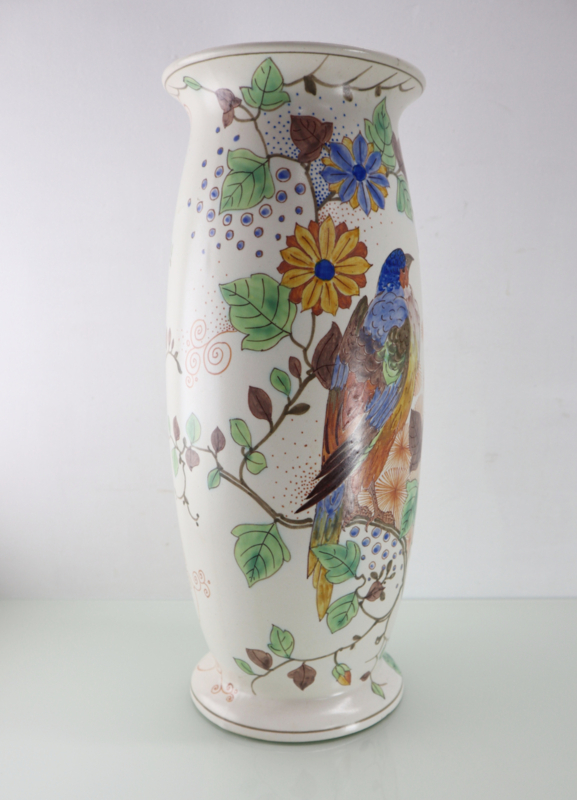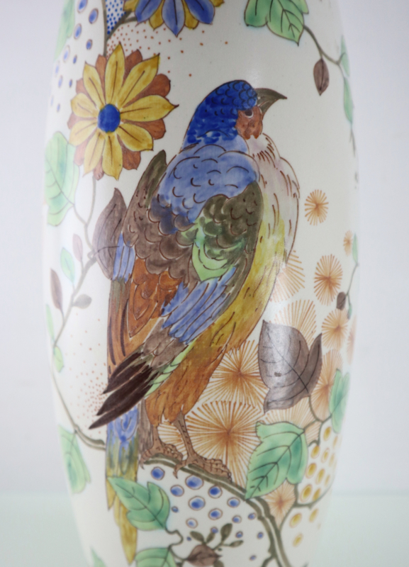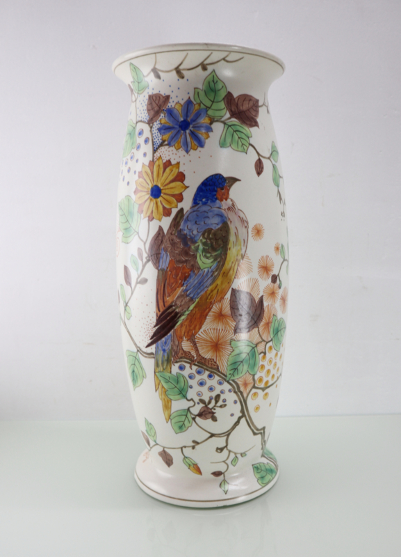 Fraaie grote plateel vaas met handbeschilderde florale decoratie en afbeelding van een vogel, gemaakt door plateelfabriek Zuid-Holland in Gouda (Plazuid). Deze vaas is gemerkt aan de onderzijde. Een mooi en zeldzaam verzamelobject, bovendien zeer decoratief.