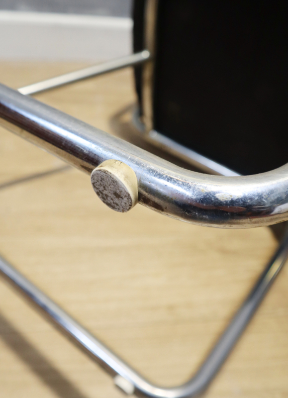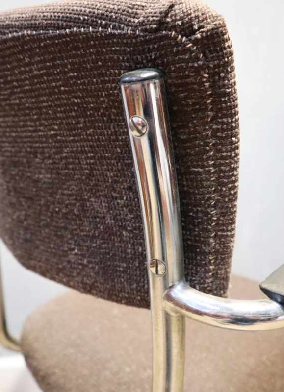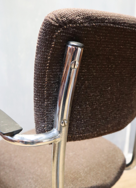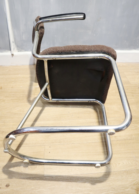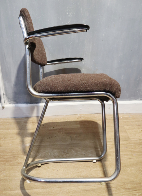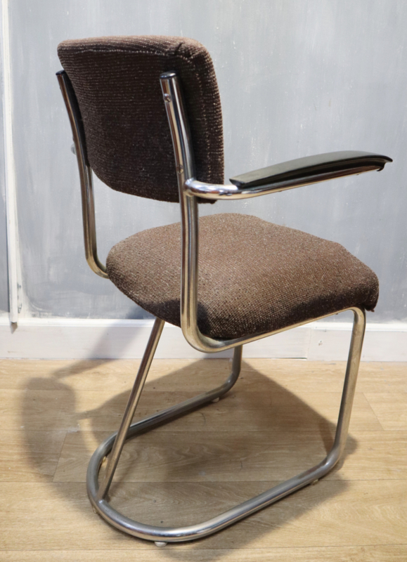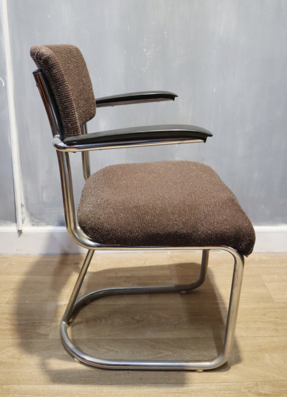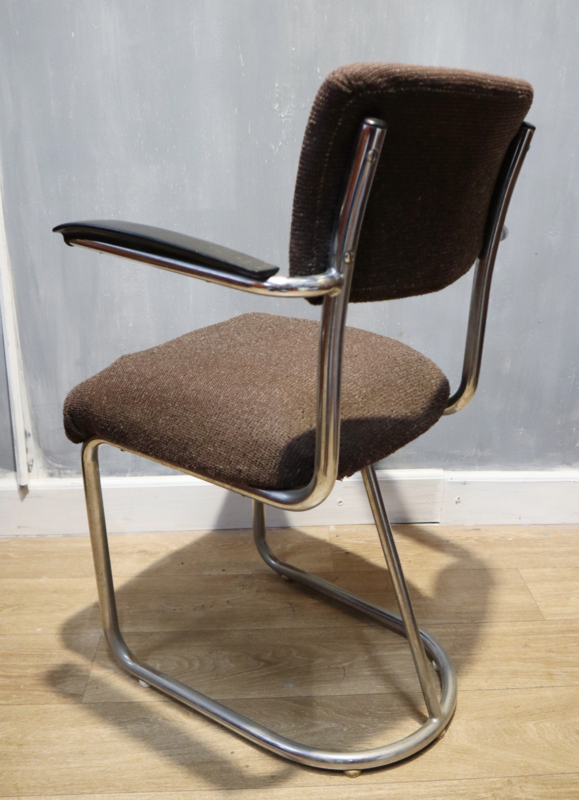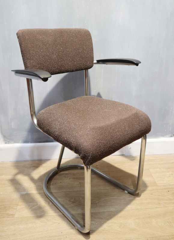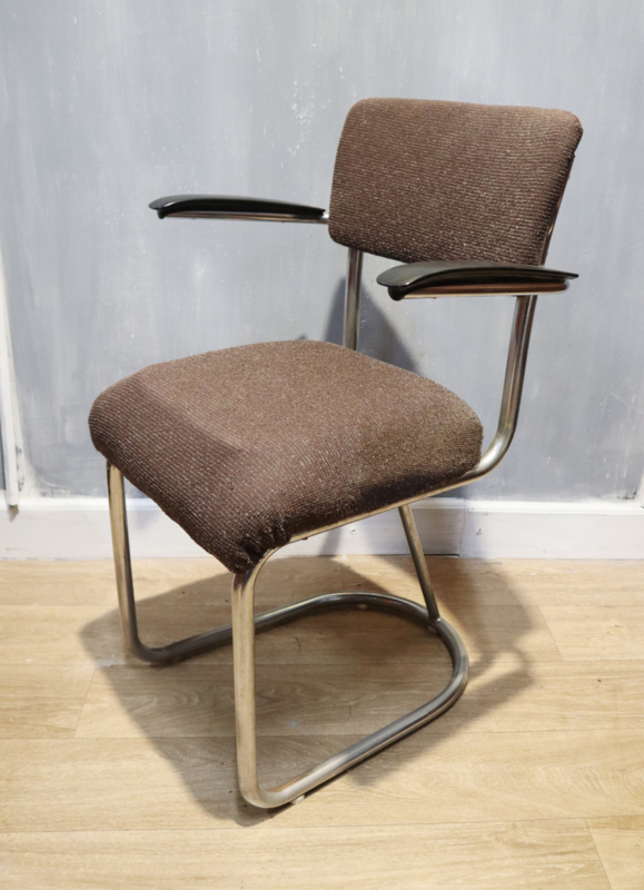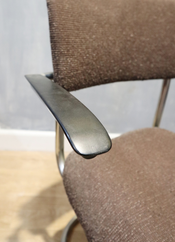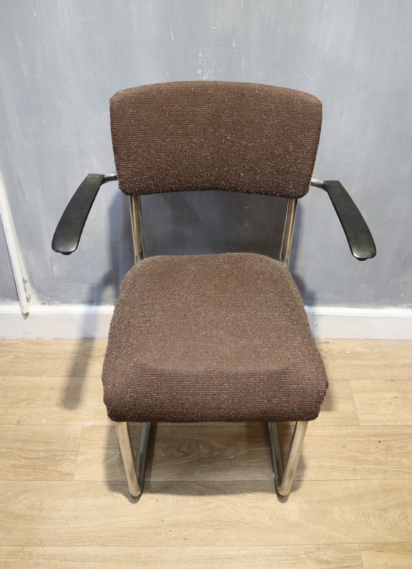 Een leuke vintage chromen buisframe armstoel in "Gispen" stijl met gevulde stoffen zitting en bakalieten armleuningen. Deze stoel betreft mogelijk een ontwerp van Paul Schuitema. Het heeft een aantrekkelijke "minimalistisch" design en uitstraling, geïnspireerd op eenvoud en functionaliteit. De stoel verkeert in een mooie vintage staat en heeft nog de originele schroeven en vloerdopjes. Een praktische stoel met een een tijdloos design.