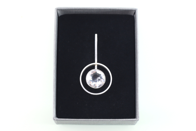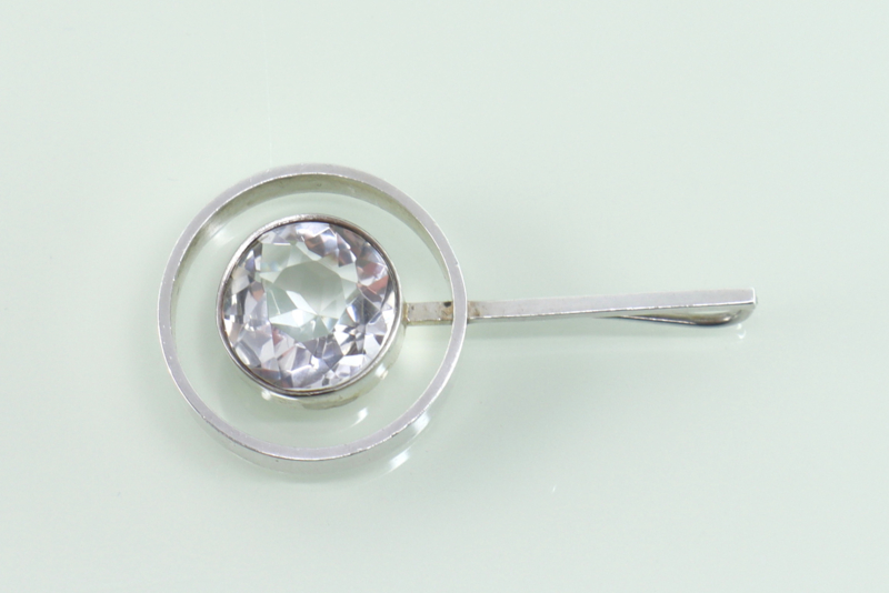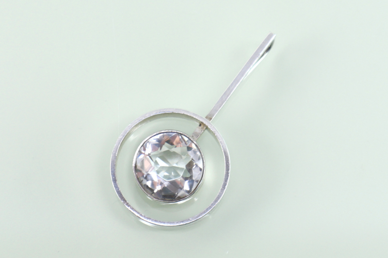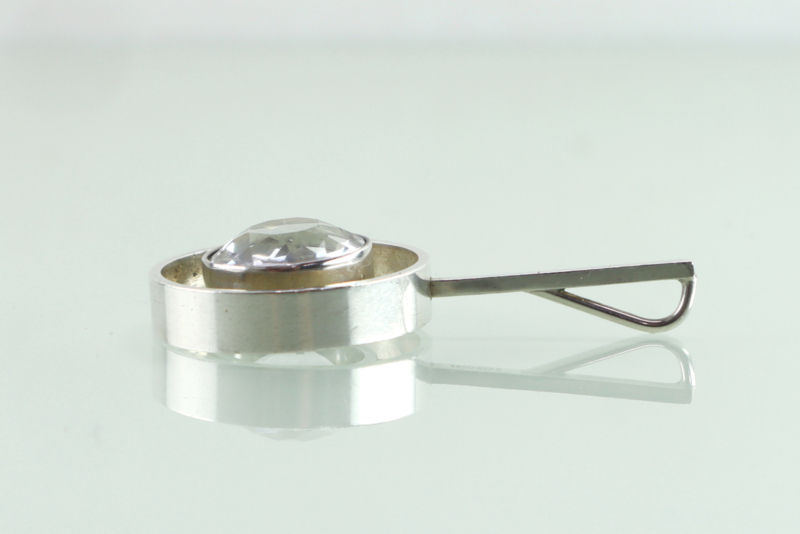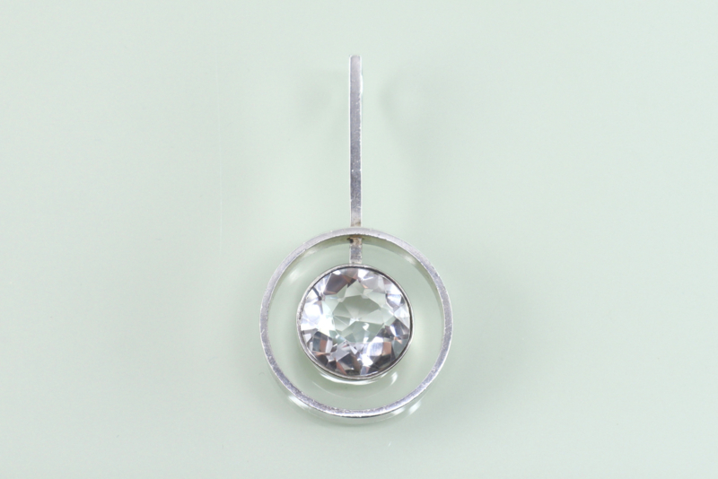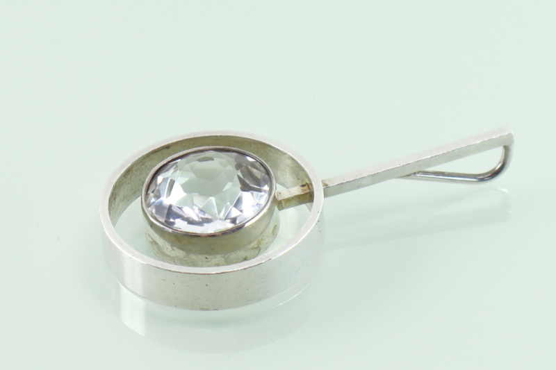 Prachtige eerste gehalte zilveren hanger met grote, facet geslepen bergkristal van de Deense ontwerper Niels Erik From uit de jaren ’70. De hanger bestaat uit een gladde zilveren rand met daarin een smallere, hogere rand waarin de bergkristal is gezet. Aan de kleinere cirkel is een vierkant stokje bevestigd dat door de grotere cirkel gaat en waarachter aan de bovenzijde een groot oog is gezet. De bergkristal heeft een diameter van 13,2 mm en is helemaal helder. De hanger is op de achterzijde van het stokje gemerkt met FROM voor Niels Erik From en 925S voor 1e gehalte zilver. De hanger verkeert in uitstekende conditie.
