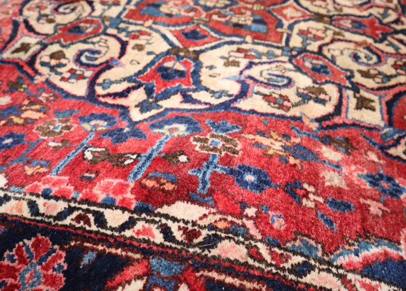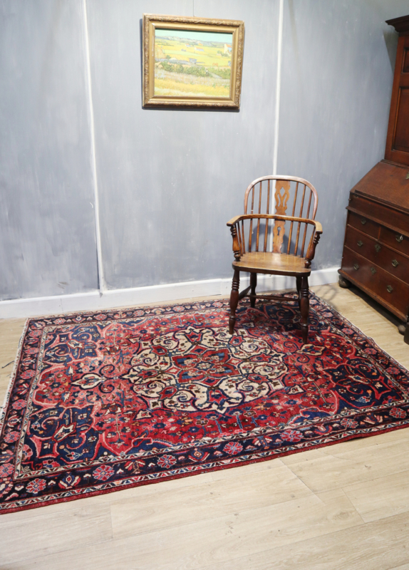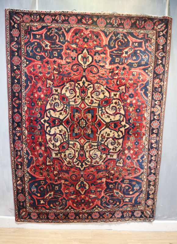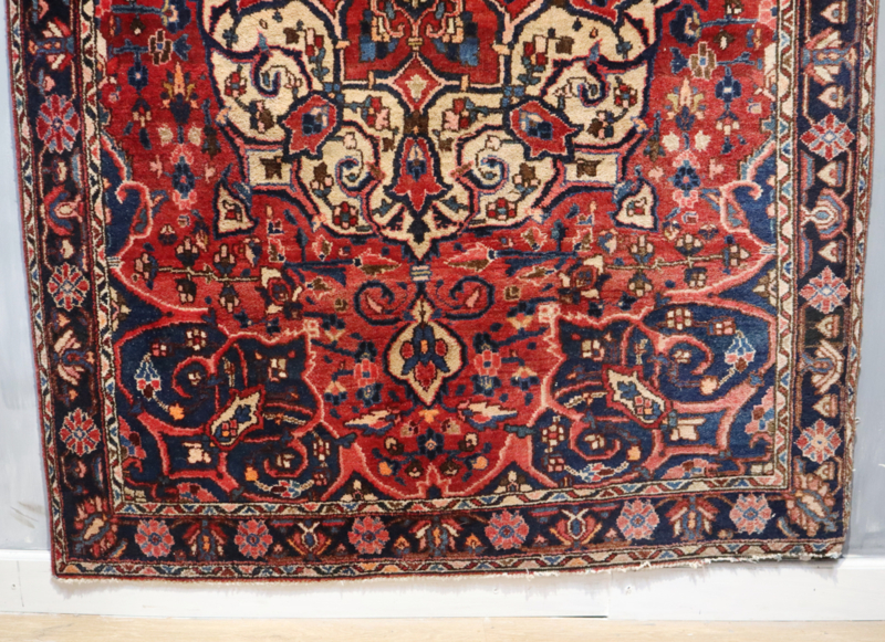 Fraai authentiek handgeknoopt Perzisch kleed type Bachtiar met aantrekkelijke kleuren en mooi uitgewerkt patroon. Bachtiar kleden staan bekend om zijn goede zware kwaliteit en fijne knoop. Dit stevige kleed (katoenen basis) is van mooie kwaliteit. Het heeft een kortgeschoren pool waardoor het mooi vlak op de grond ligt. Zeer decoratief en chique uitstraling. Lichte slijtage aan 1 korte rand.