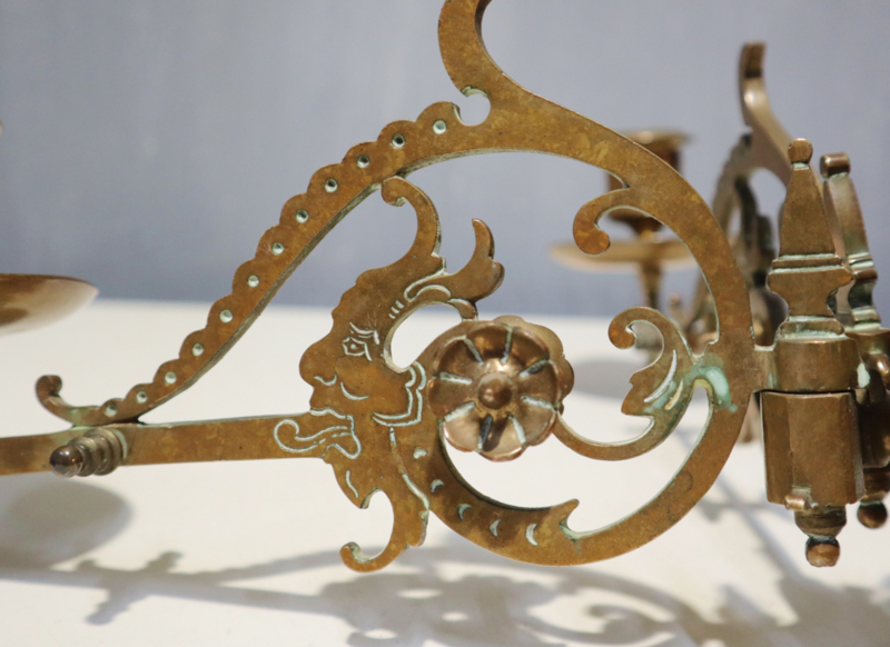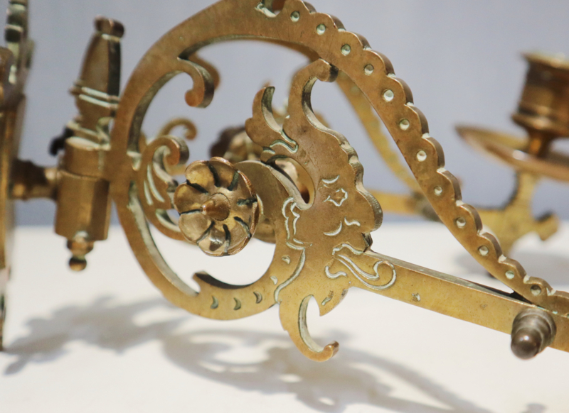 Stijlvolle koperen pianokandelaar/wandkandelaars met twee armen. Deze kandelaars is van een goede kwaliteit en is zwaar uitgevoerd met mooie en leuke details. Geschikt voor standaard dinerkaarsen.