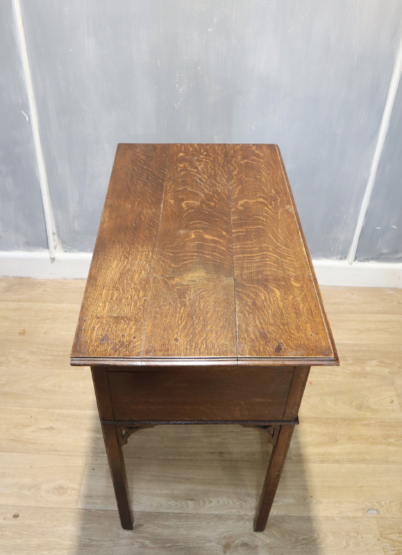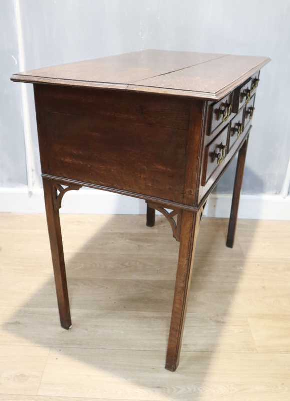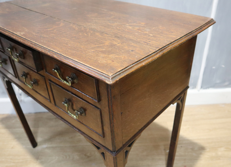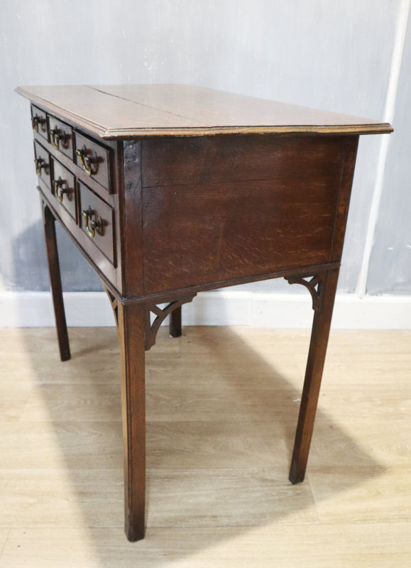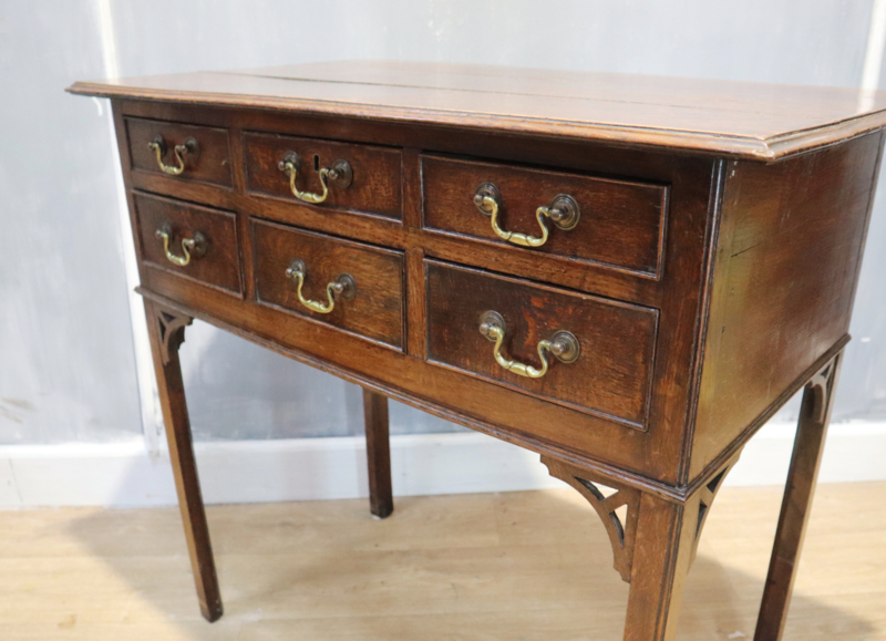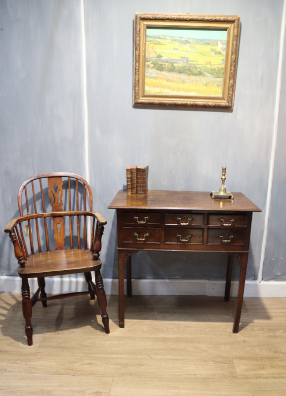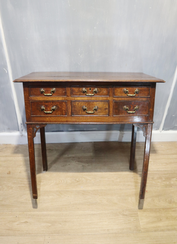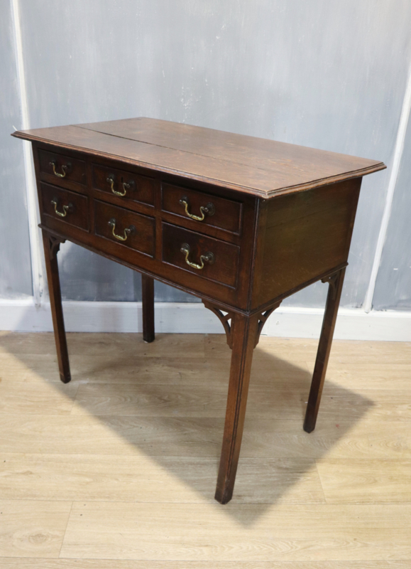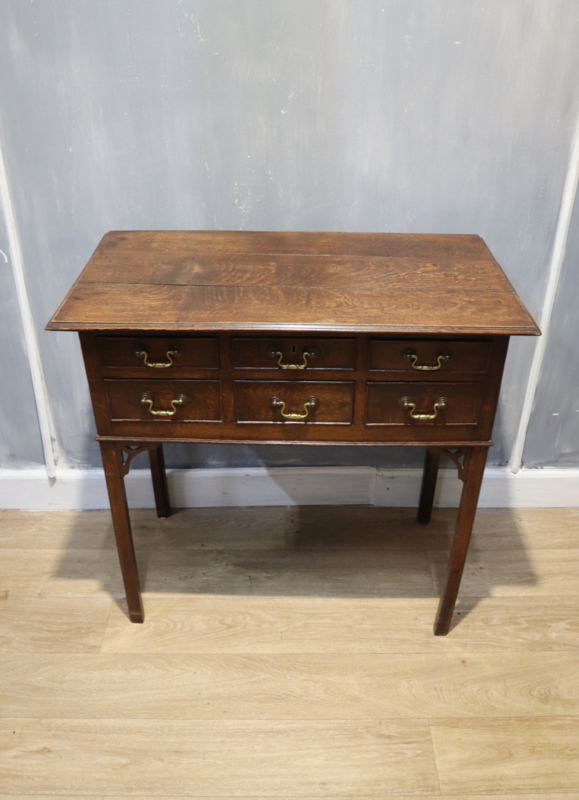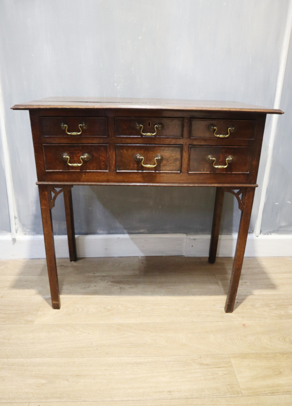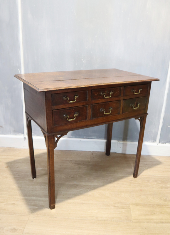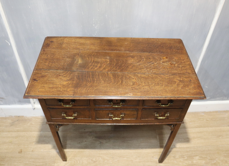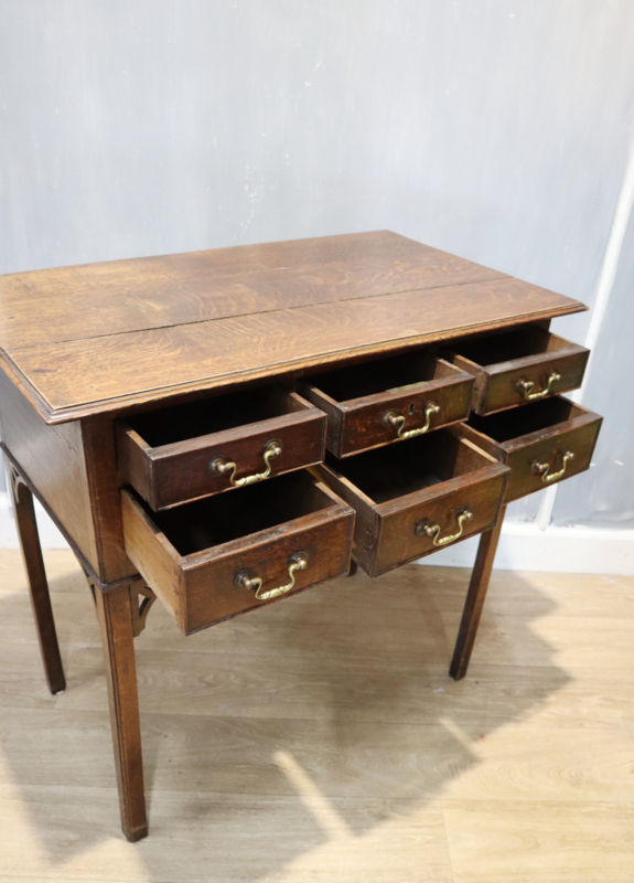 Stijlvol antiek Engels wandtafeltje / Lowboy met 6 laadjes, staande op rechte poten. De laden zijn voorzien van stijlvol messing ladentrekkers. Het blad heeft een mooi (origineel) facetrandje. Dit type tafeltjes werden vroeger door dames ook wel als schrijftafeltje gebruikt. Door het niet al te grote formaat makkelijk in te passen in ook kleinere ruimtes zoals een hal of gang. Praktischen en van mooie kwalieit, zeer stijlvol.