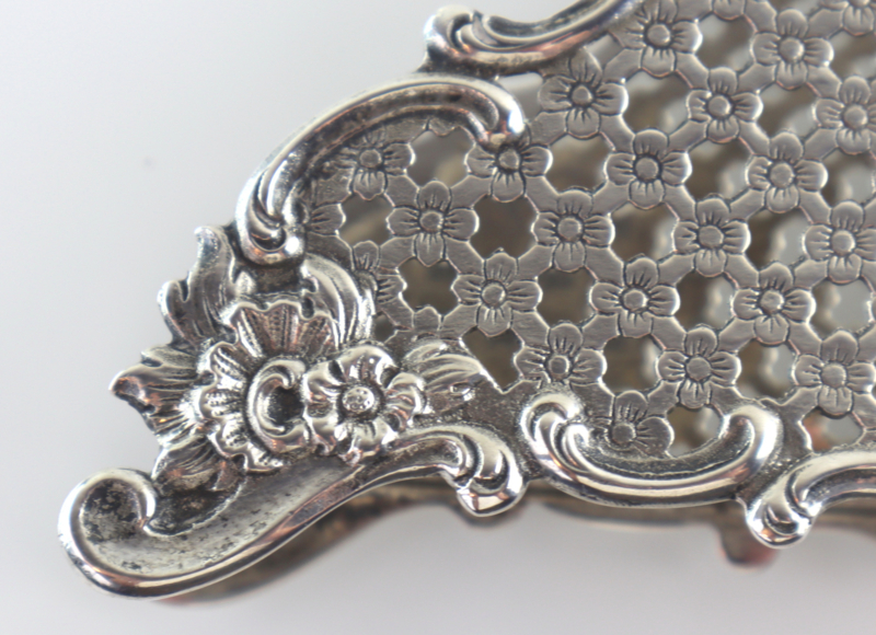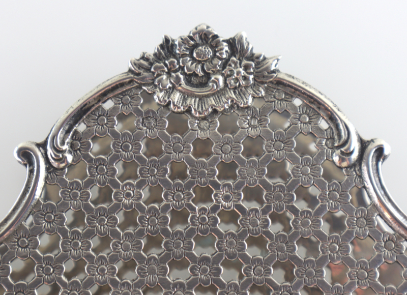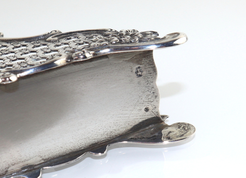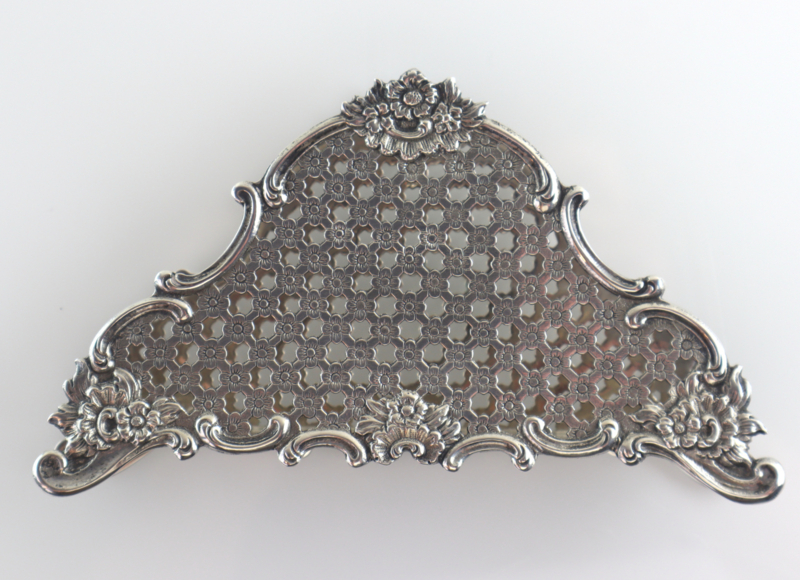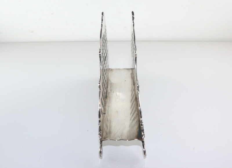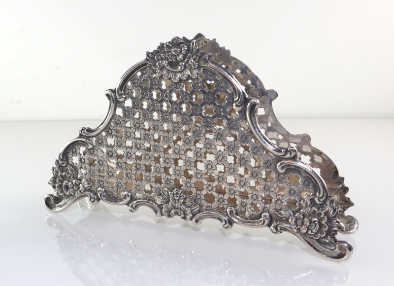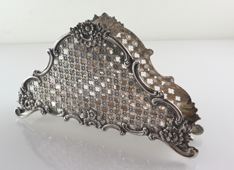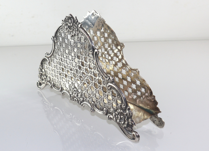 Zilveren servethouder of brievenhouder met een raster van bloemetjes en C-voluten. Deze servethouder is gemaakt van 2e gehalte zilver bij de Zaanlandse Zilversmederij (Haarlem/Amsterdam, 1920-1990) in 1955. Volledig gekeurd met lopende leeuw (op beiden zijden en de onderzijde), minervahoofdje (Amsterdam), jaarletter en meesterteken. In goede conditie.
