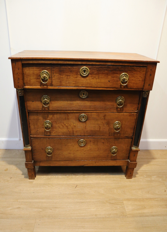 Antieke Hollandse Empire ladekastFraaie antieke Hollandse ladekast / commode met vier laden en aan weerszijden zwartgelakte hele pilaren, staande op originele blokpoten. De laden, die soepel op en dicht gaan, zijn voorzien van authentieke koperen ringbeslag en…