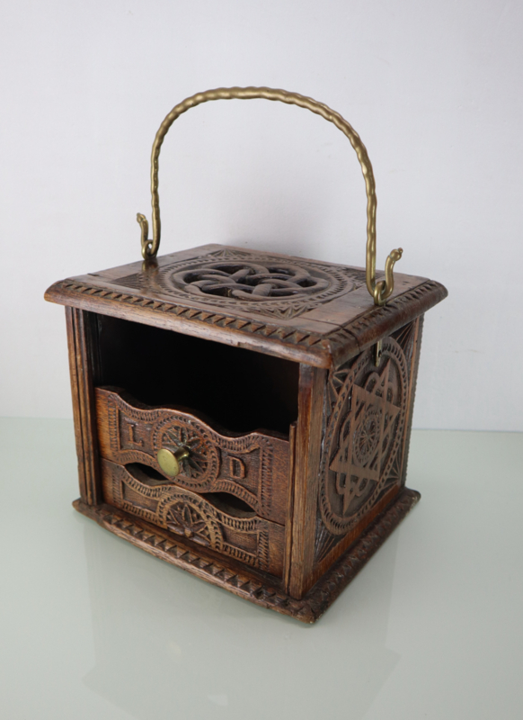 Antieke stoofMooie antieke stoof (voetenstoof) met rondom fraaie decoratie en aan de voorkant twee schuifjes met initialen "LD". De bovenkant heeft een mooi uitgewerkte zogenaamde "Turkse knoop". Ook de onder-en bovenrand hebben uitgesneden…